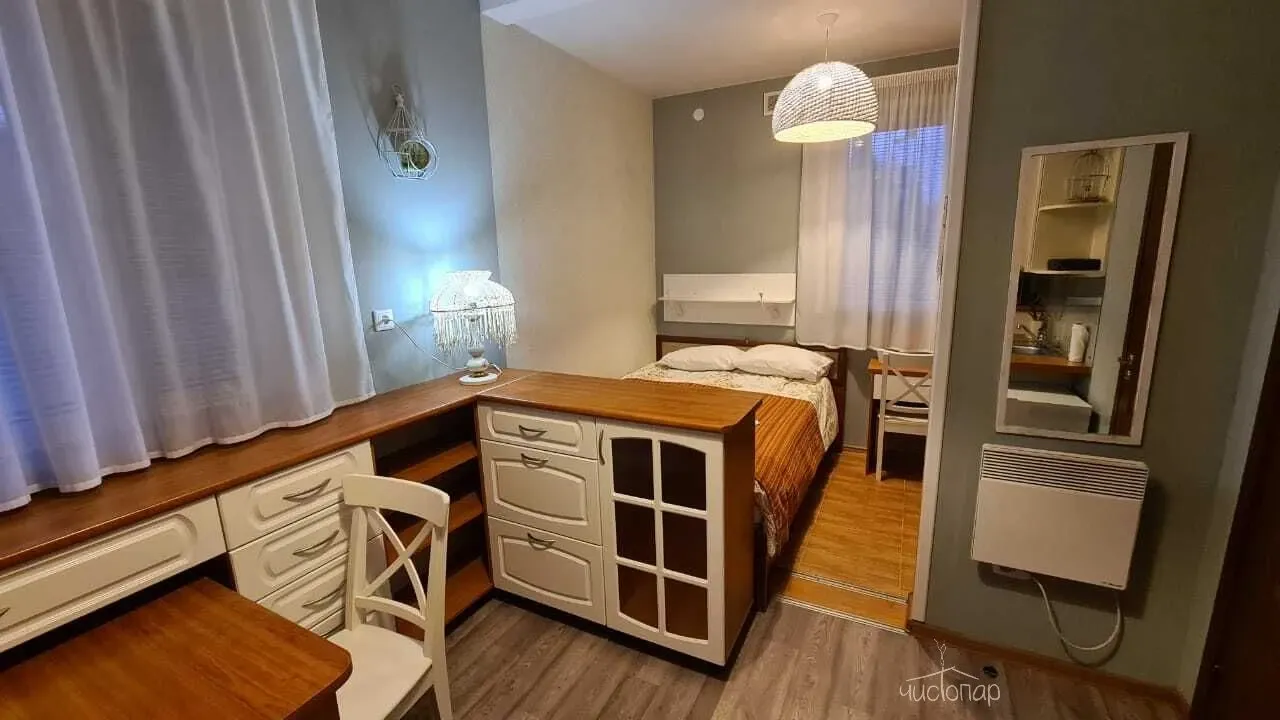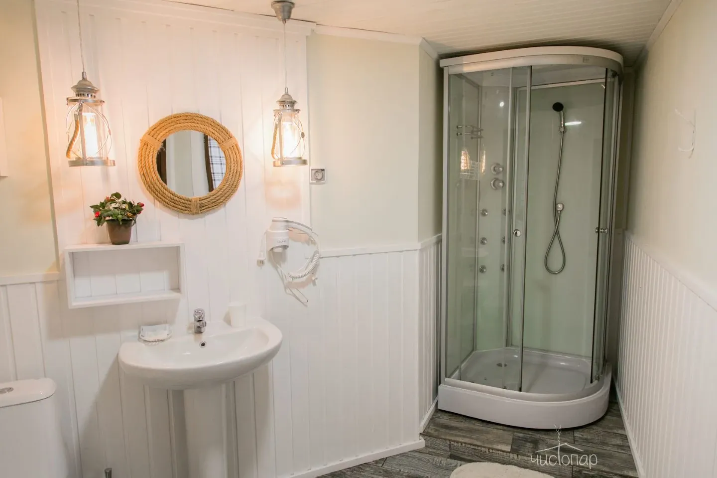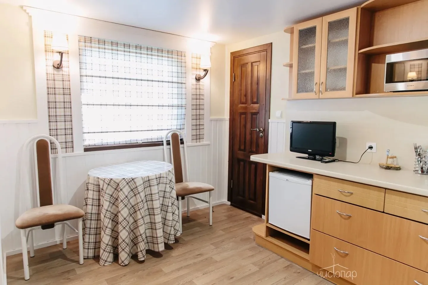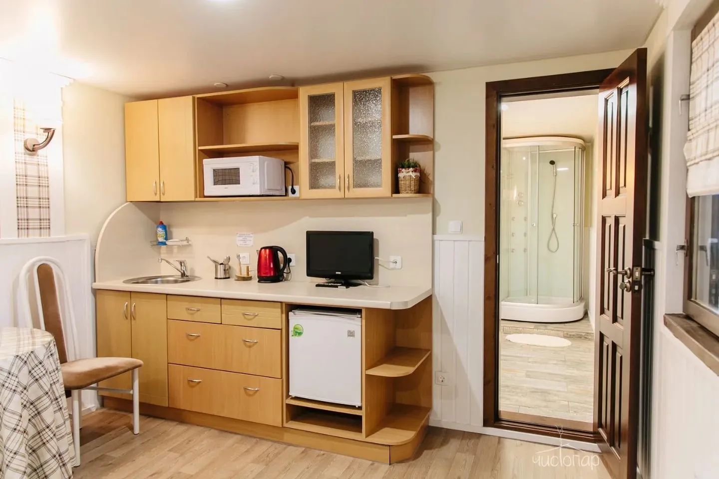 Телевизор, раздельный душ/туалет, фен, холодильник, мини-кухня, электрочайник, СВЧ печь, набор посуды, шкаф/гардероб, двуспальная кровать.