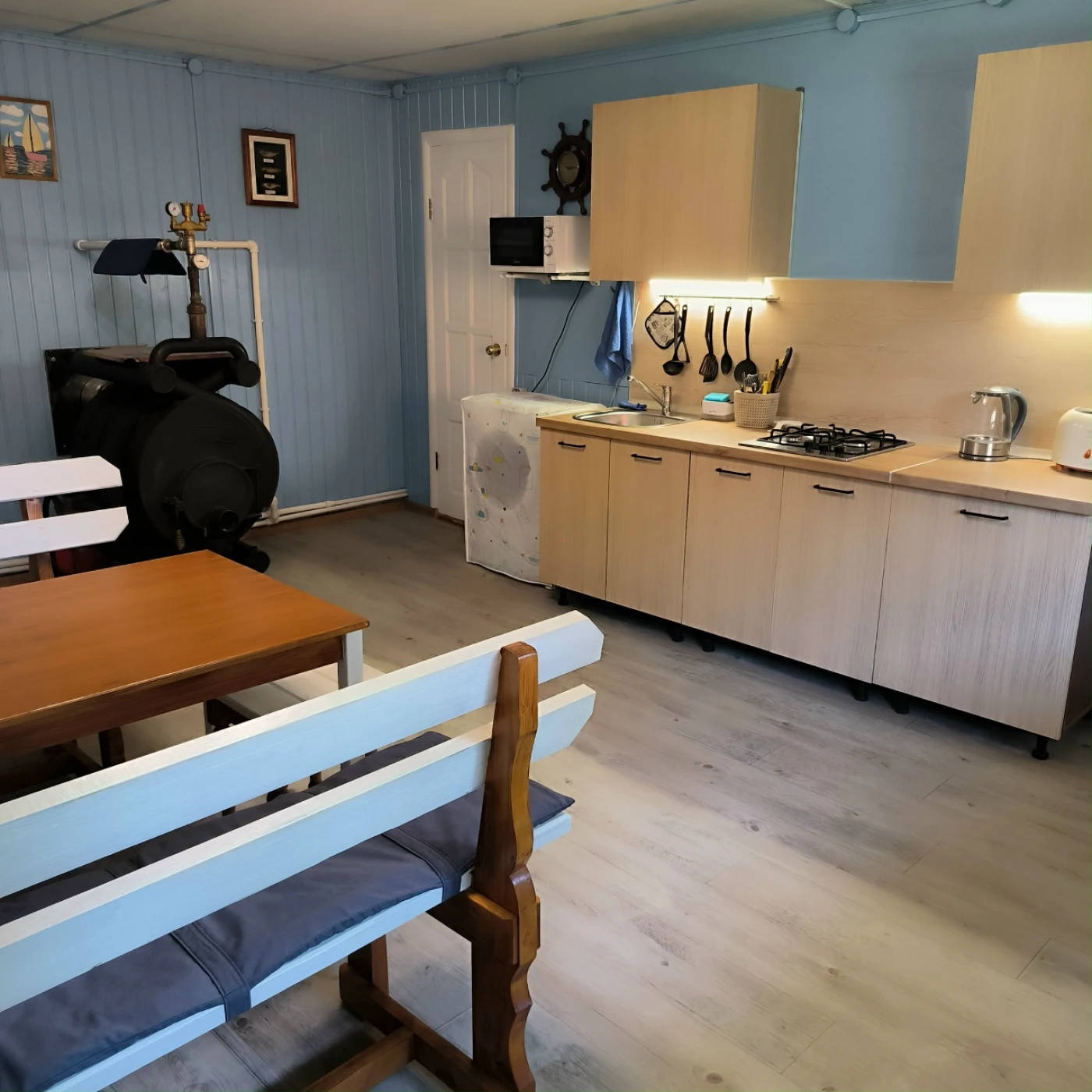 Двухкамерный холодильник, газплита, СВЧ, чайник, кофеварка, телевизор, постельное белье и полотенца - все это есть. Также не надо привозить питьевую воду!!! В кране течёт чистейшая вода из скважины.