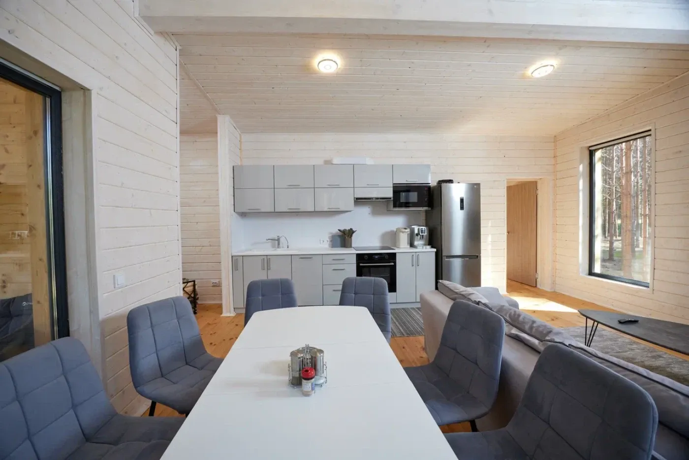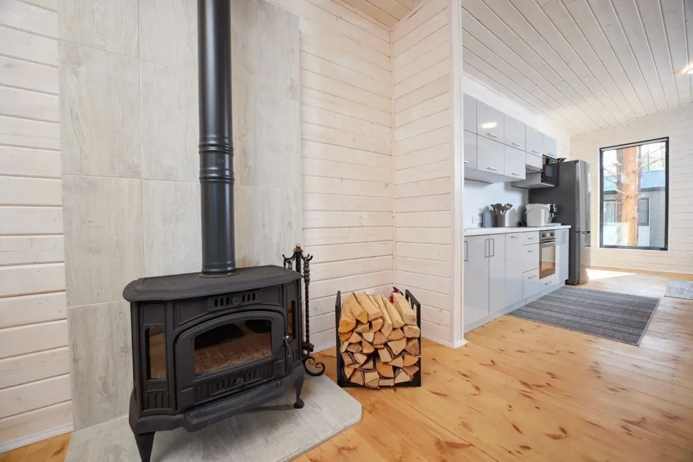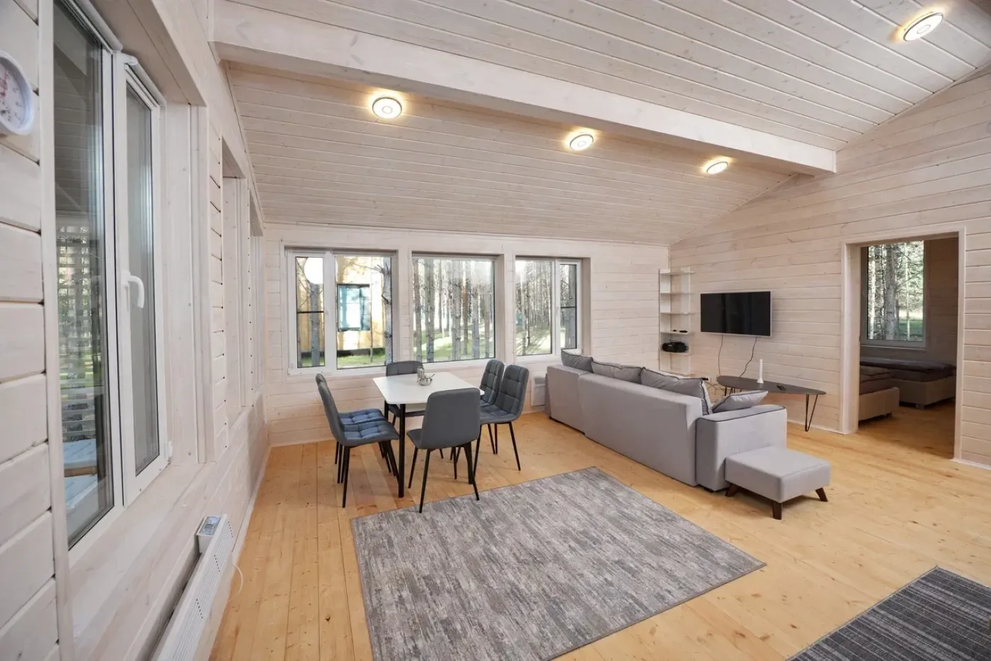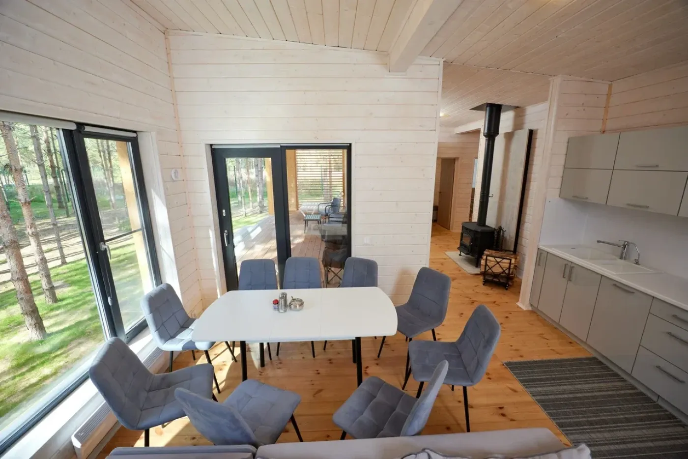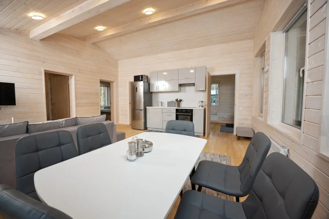 Дом с банным чаномУютный гостевой дом для 4 человек: Спальни: 2 (с двуспальной кроватью и две 1,5 спальные кровати) Общая зона: Просторная кухня-гостиная с обеденным столом, мягкой зоной отдыха перед камином.