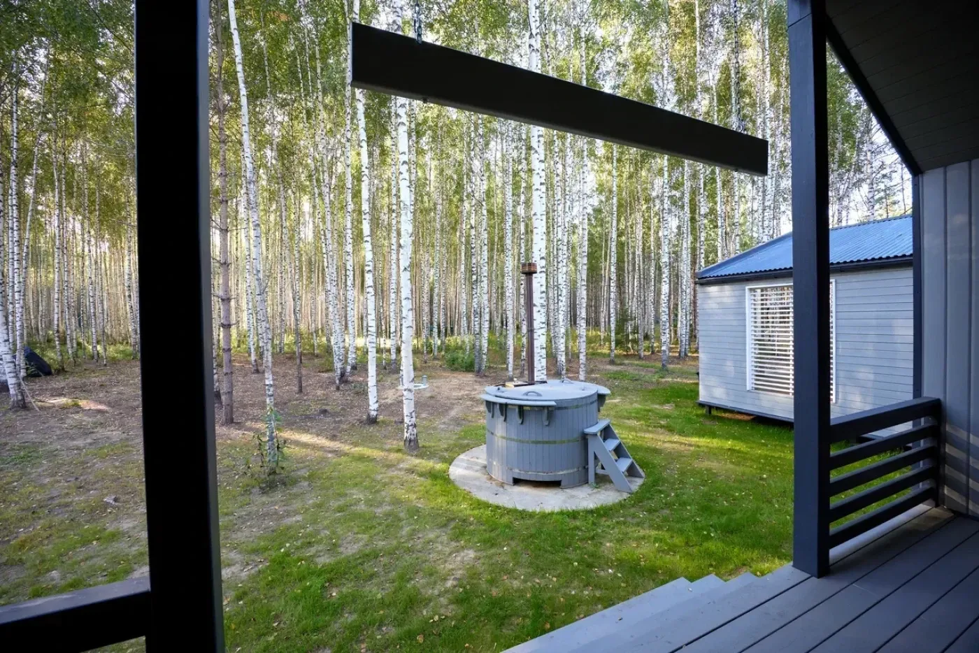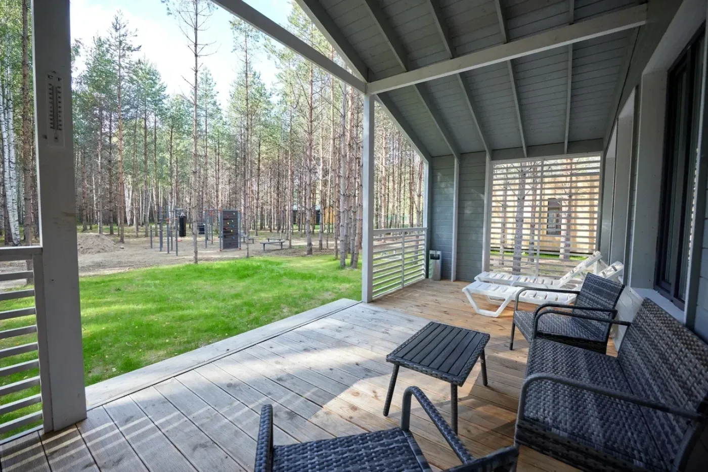 Веранда: Большая терраса с панорамным видом на лес, уличной мебелью и возможностью отдыха на свежем воздухе.