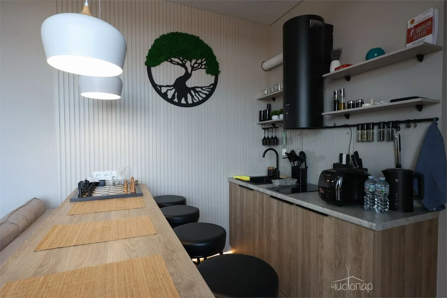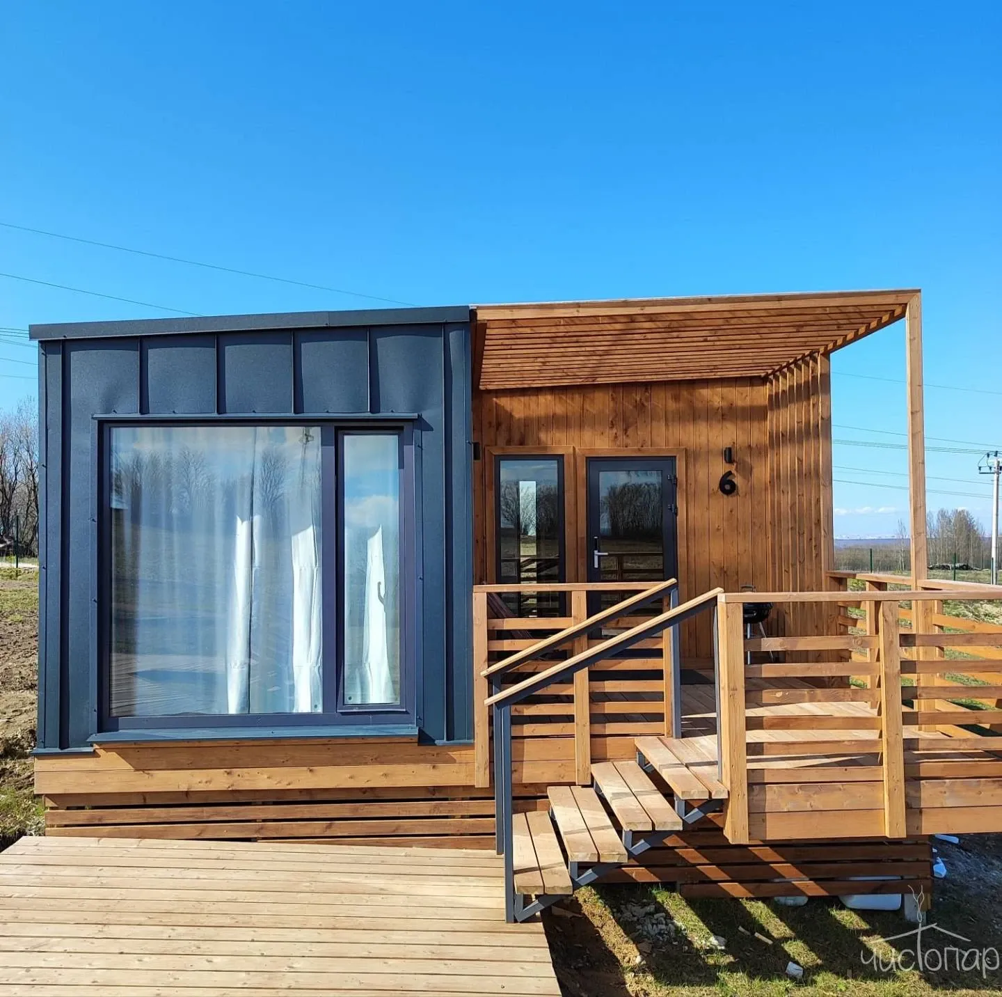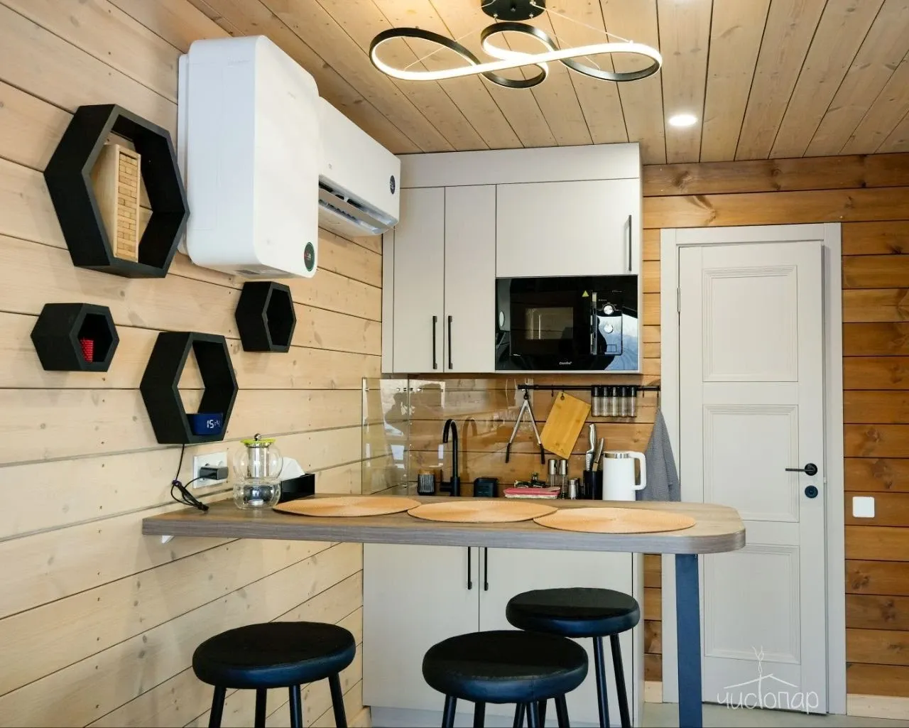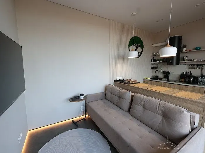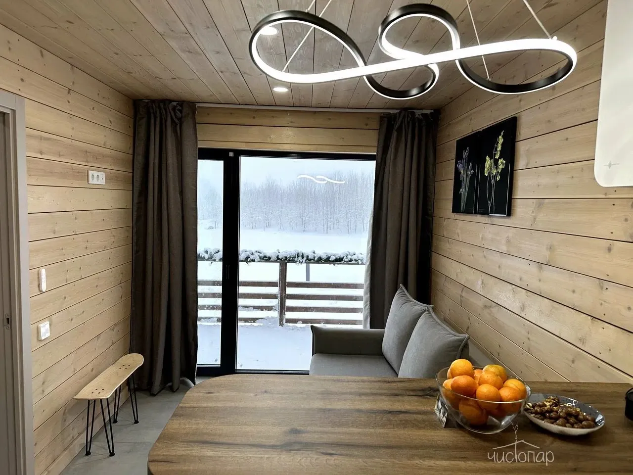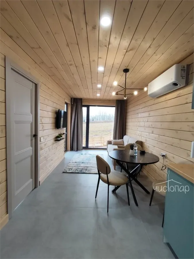 Видовое Шале повышенной комфортности. Современная гостинная с раскладным диваном, элегантным телевизором и барной стойкой, камин. Кухня оборудована новейшей бытовой техникой Xiaomi, плитой и вытяжкой, холодильником и чайником, мультиваркой а ванная комната балует гостей роскошным набором удобств, включая одноразовые зубные щетки, махровые халаты и набор туалетных принадлежностей. В спальне имеется кровать King Size, элегантные светильники, обеспечивающие безупречный высокотехнологичный отдых. Вдоль стен, вместо плинтуса, встроена подсветка, которая создает эффект "парящих стен". Smart-шторы и оборудование с голосовым управлением улучшают атмосферу, делая этот коттедж оазисом удовольствия и инноваций. Просторная терраса с качелью и зоной барбекю.Читать далее
