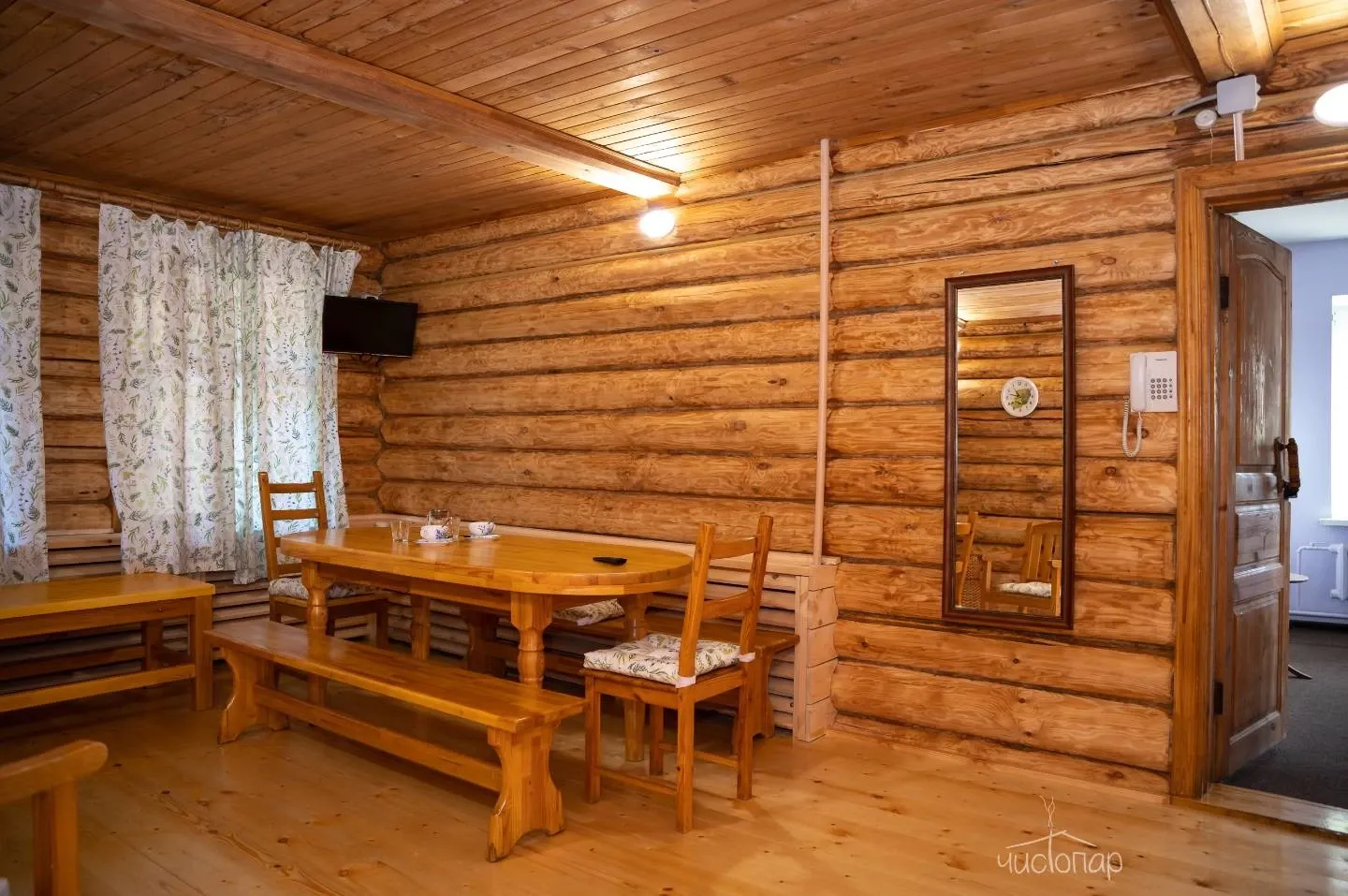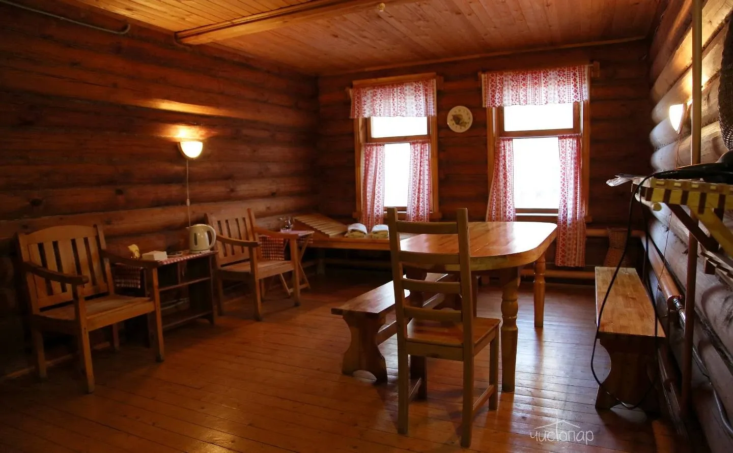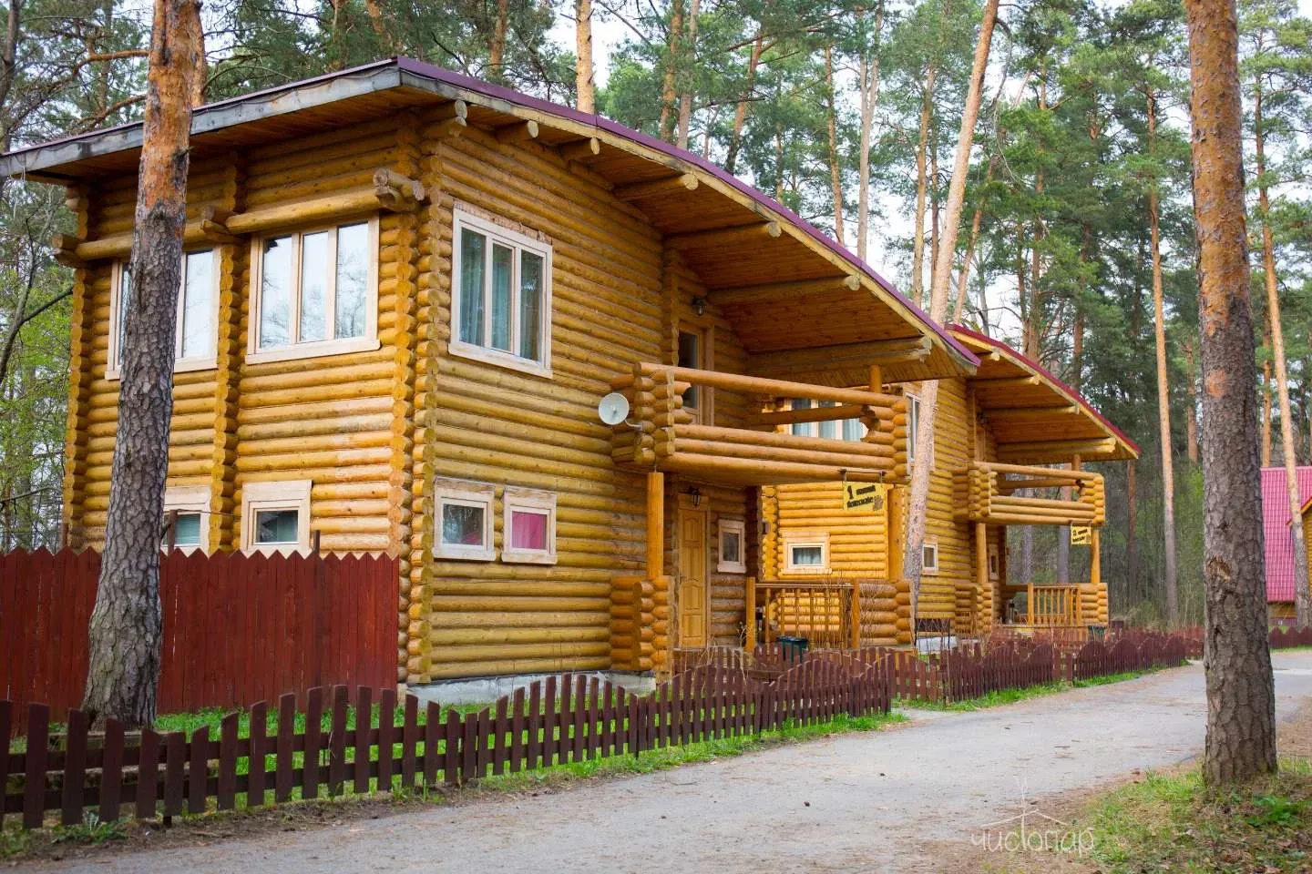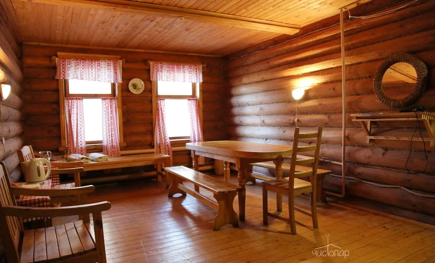 Гостям предлагают проживание в деревянных коттеджах и номерах разной категории, а также питание по системе «шведский стол».