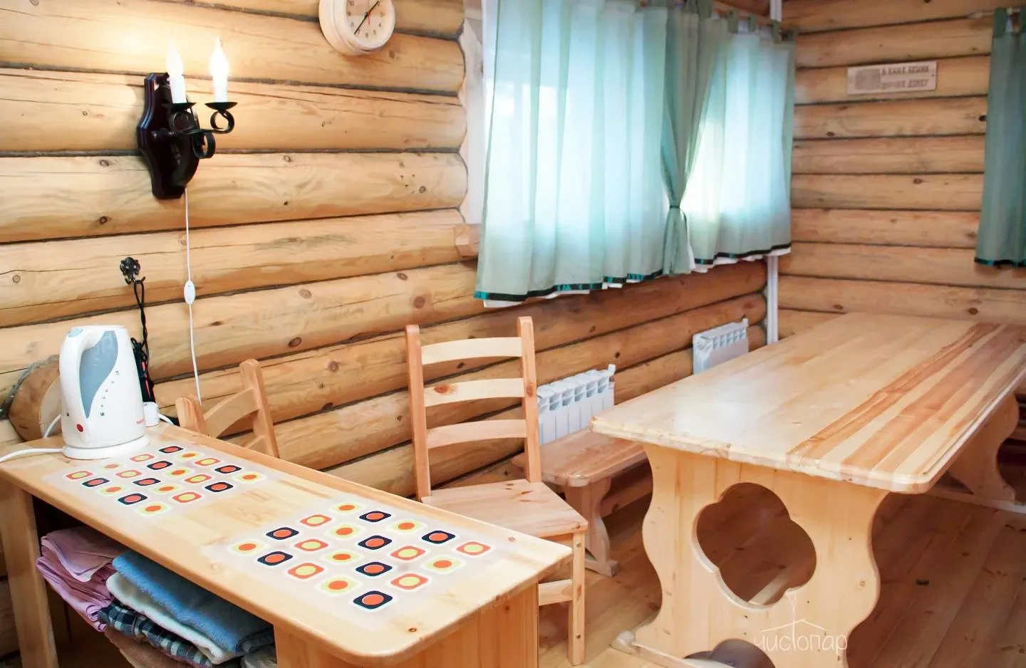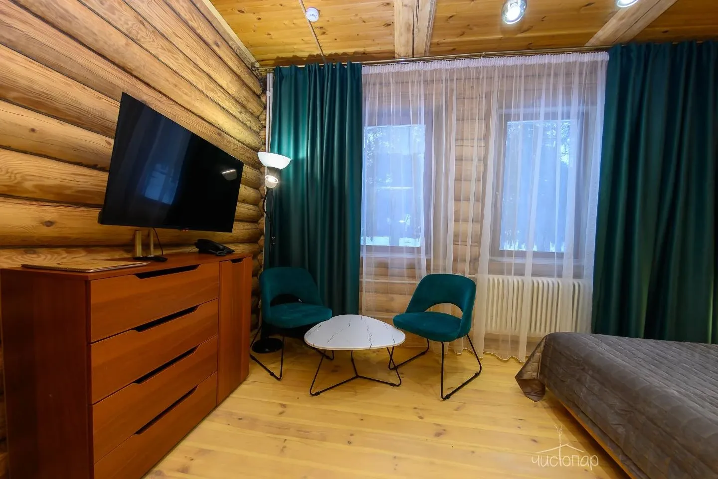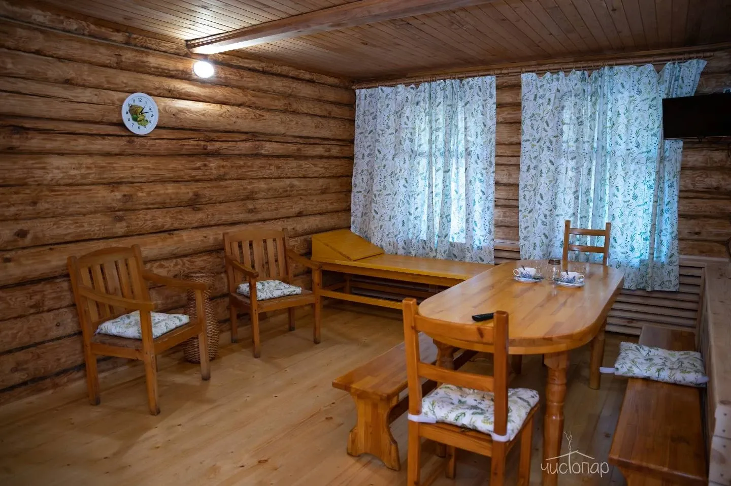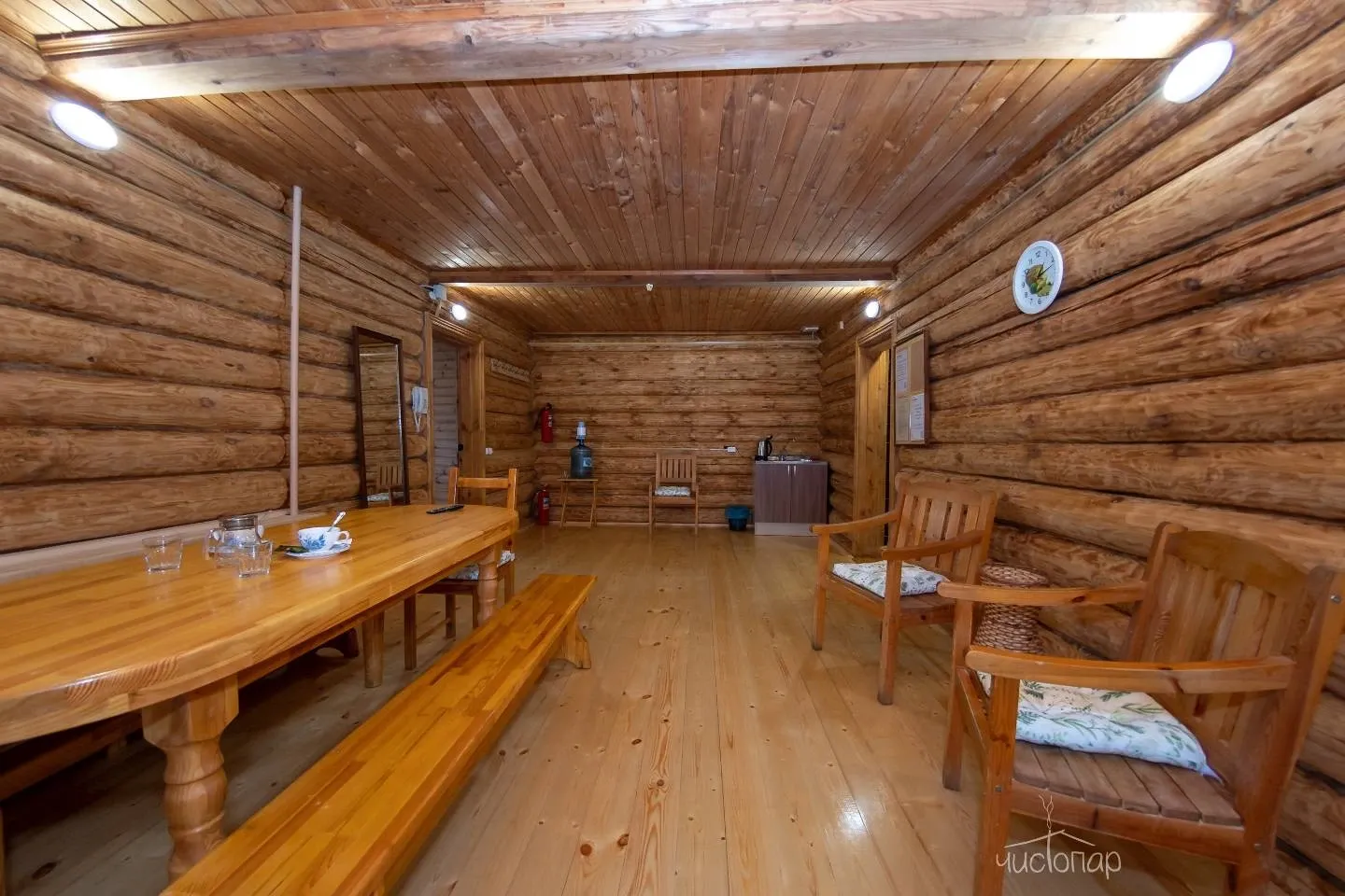 Гостям предлагают проживание в деревянных коттеджах и номерах разной категории, а также питание по системе «шведский стол».