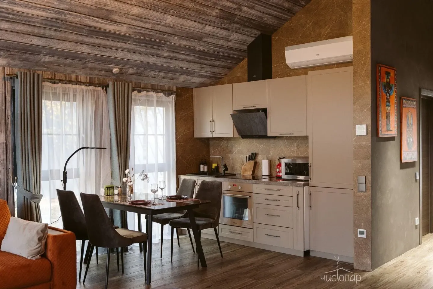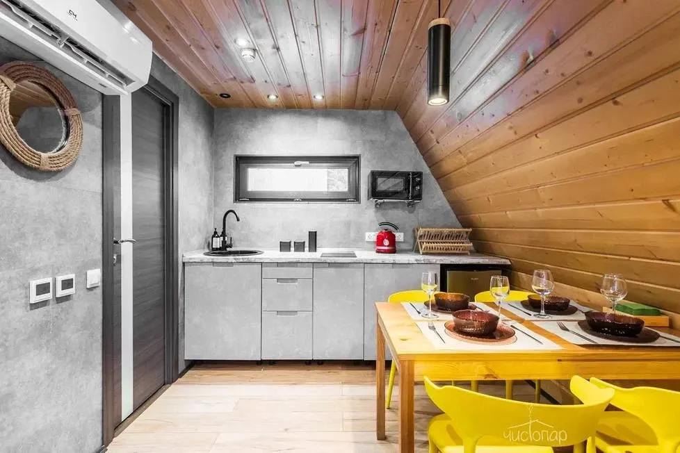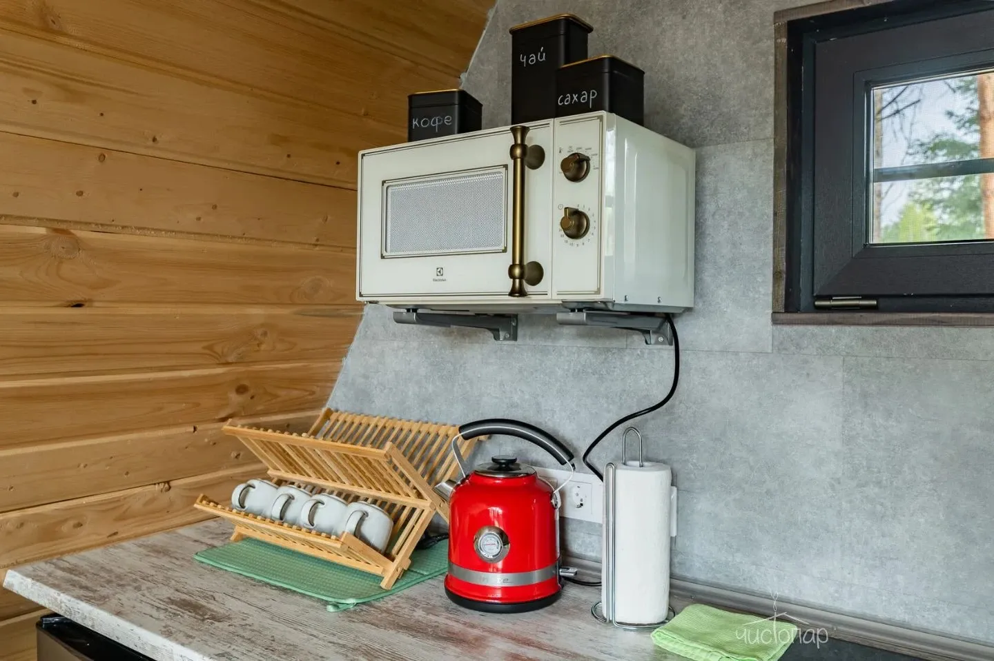 Каждый дом укомплектован кухонный гарнитуром и бытовой техникой, чтобы постояльцы могли самостоятельно приготовить еду. На свежем воздухе оборудована гриль-зона.