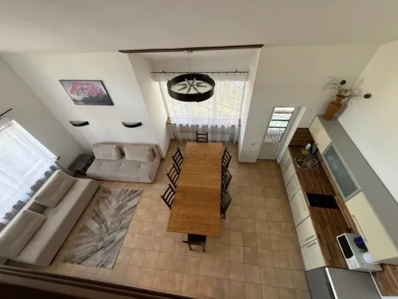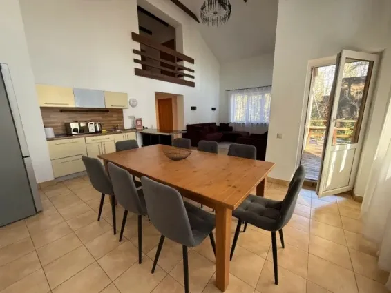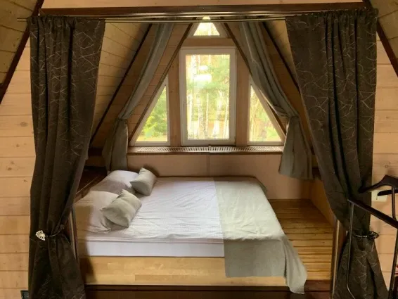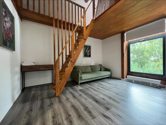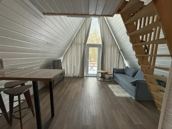 Двухуровневый семейный коттедж-студия (32кв.м + терраса 16кв.м). Гостиная-кухня на первом уровне и двуспальный матрас на втором. В гостиной раскладной диван (спальное месть 160см.), телевизор (SMART TV) , барная стойка, мини-кухня. Терраса с видом в сад. Разрешено проживание с домашними животными.