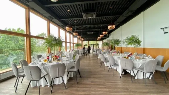 - Залы и террасы для проведения мероприятий разной вместимости на 4-х уровнях с видом на Оку.
