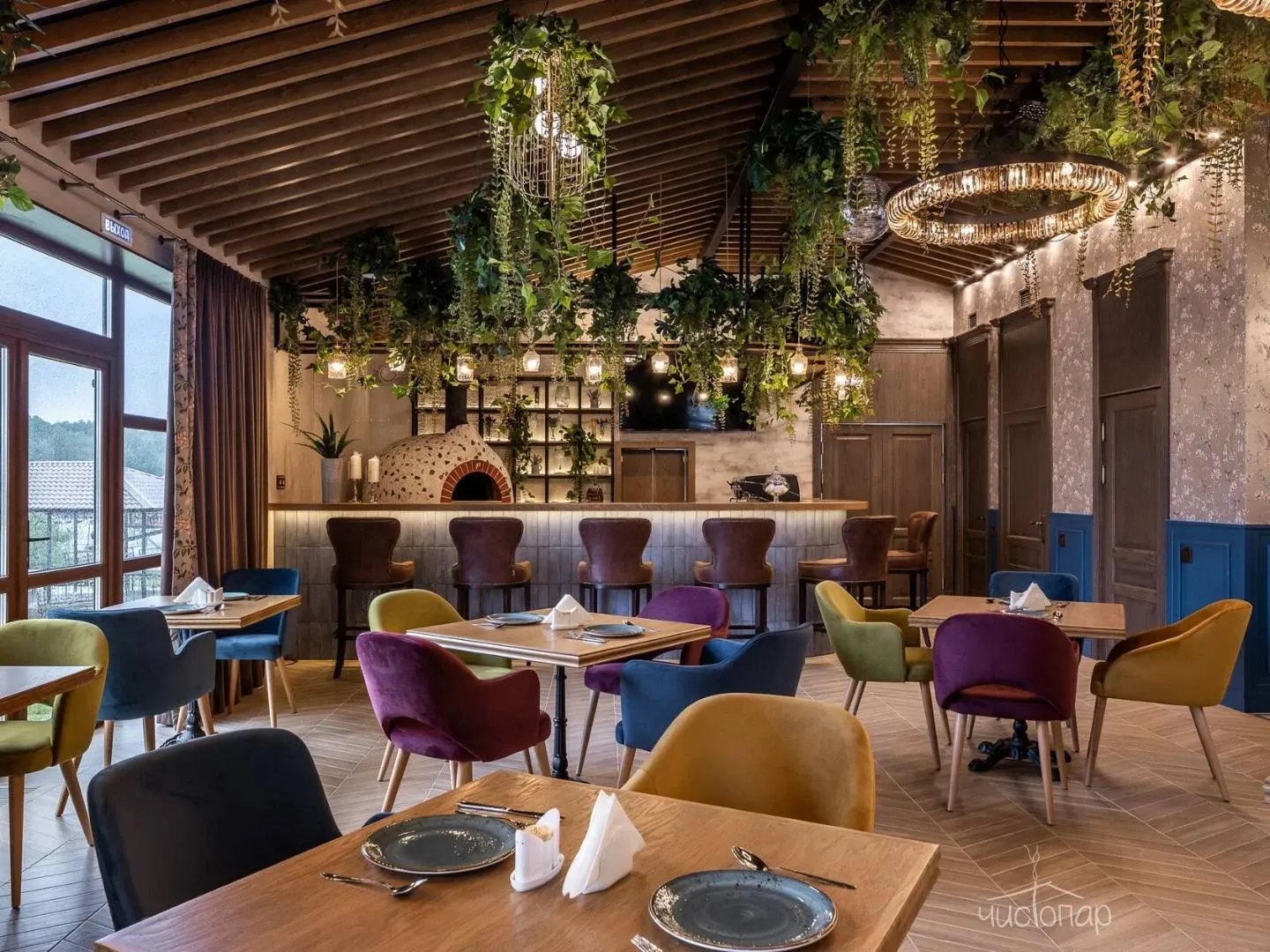 - На территории клуба работает ресторан с детской зоной и настоящим камином на дровах;