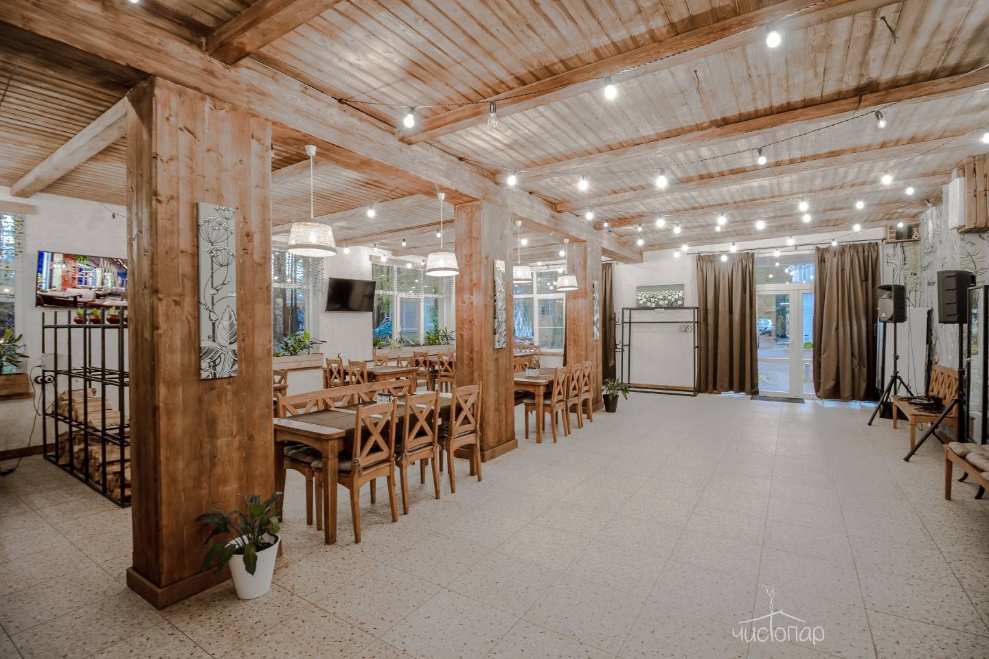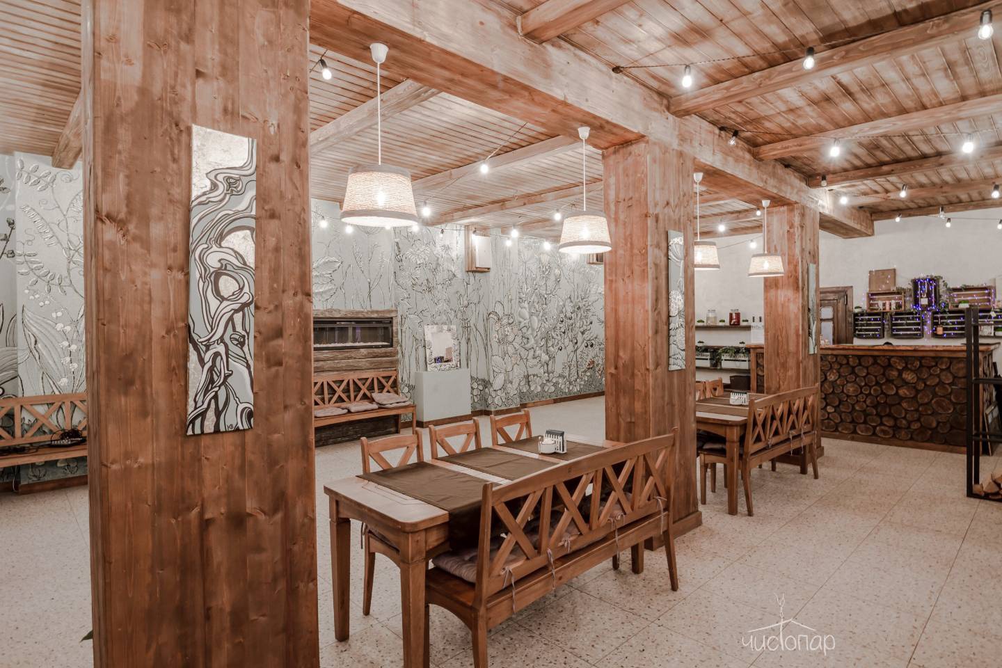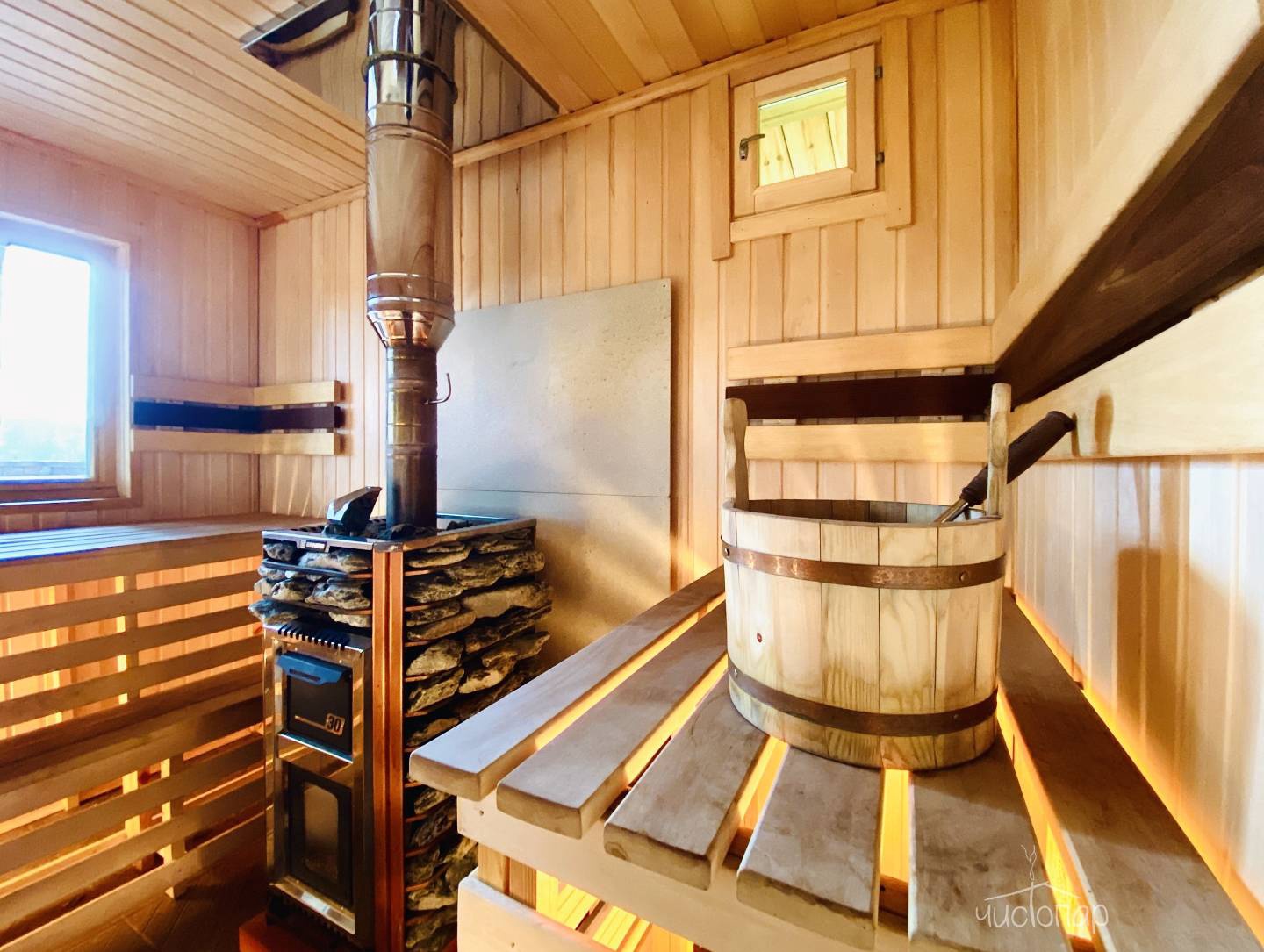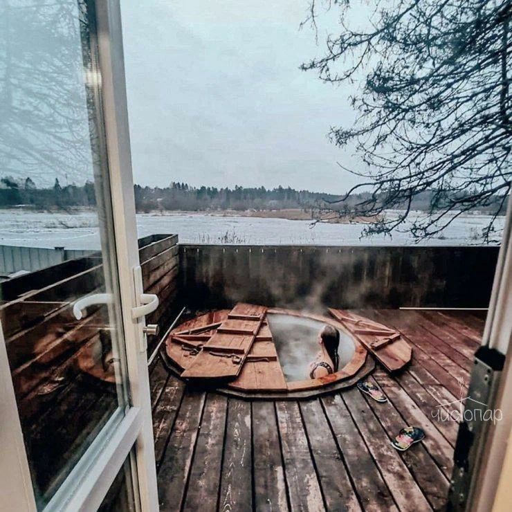 Интерьер банных комплексов выполнен целиком из дерева, а планировка включает большой гостевой зал, где можно собраться большой компанией, комнату отдыха с диваном, парную с панорамным окном, санузел и душевую с контрастным душем.
