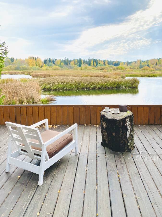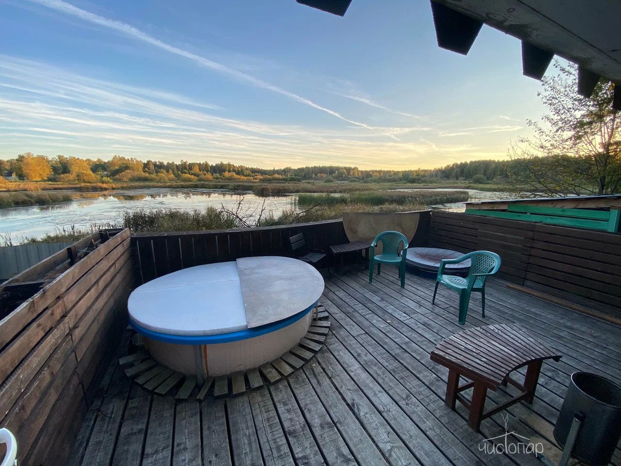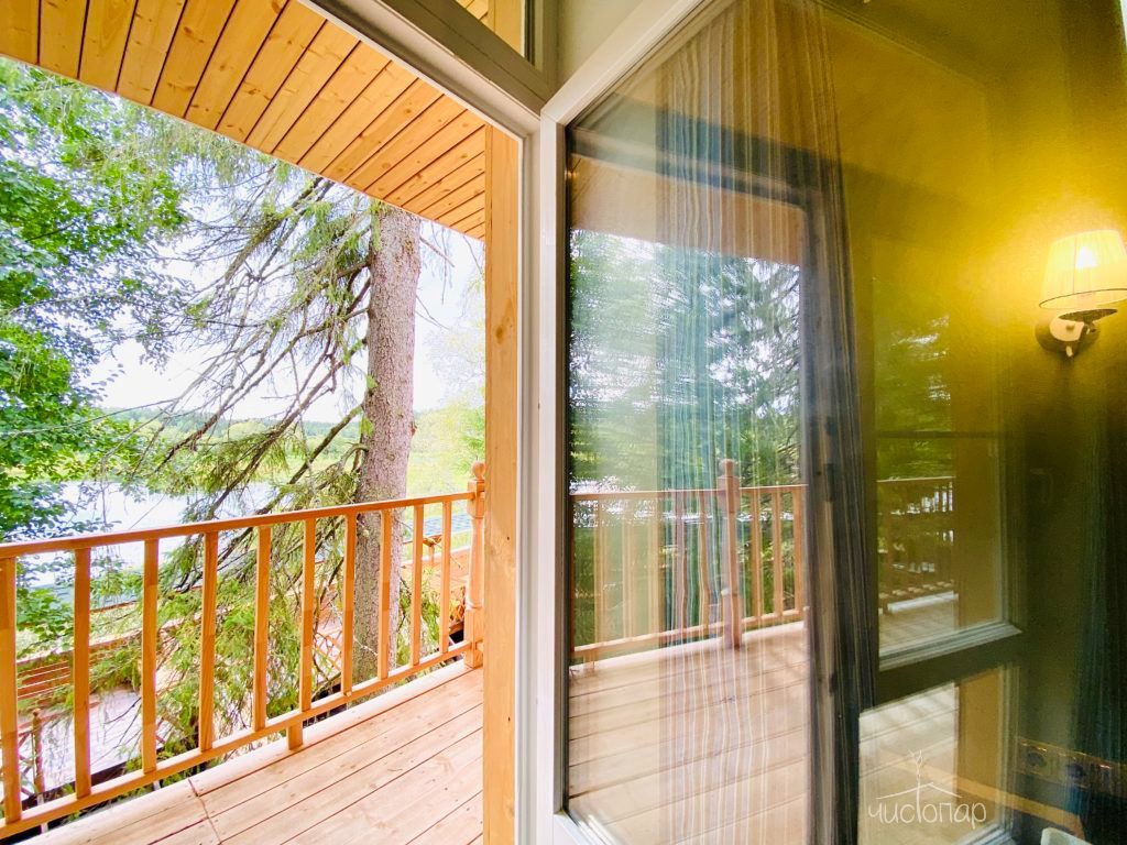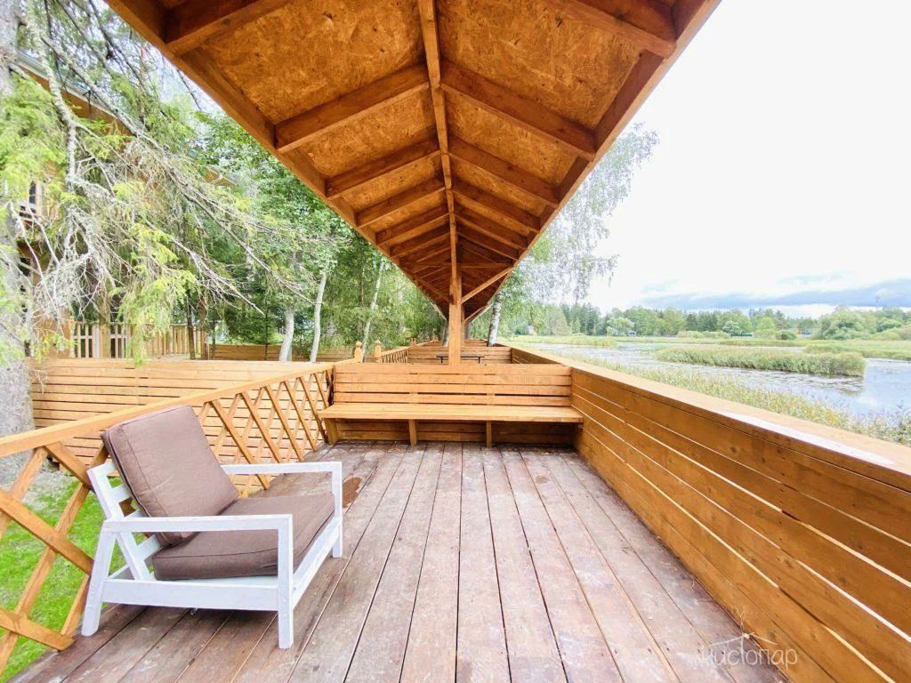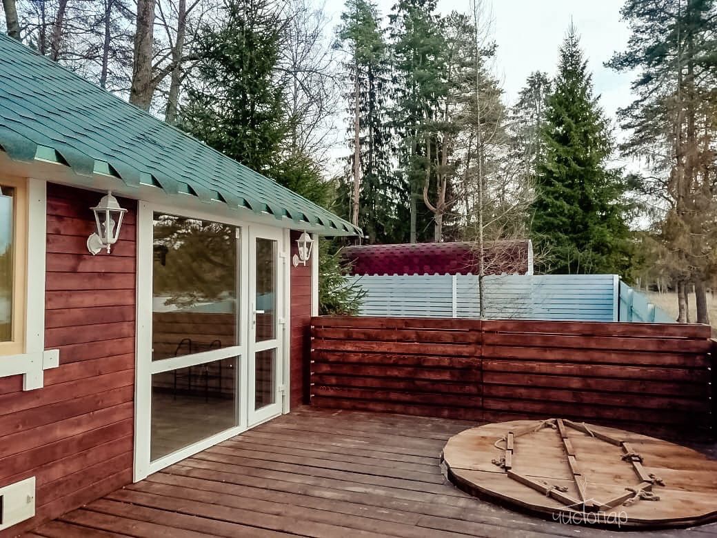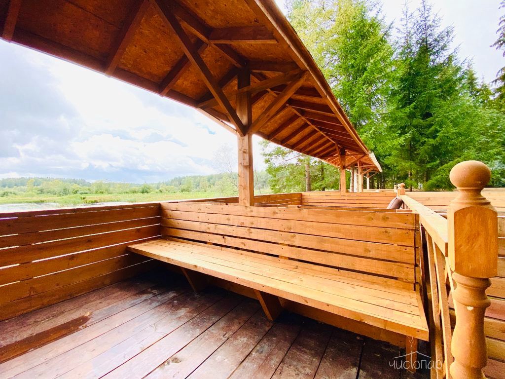 Русская баня на дровах с видом на заводь реки Оредеж и выходом на террасу. База имеет две бани с купелью фурако.
