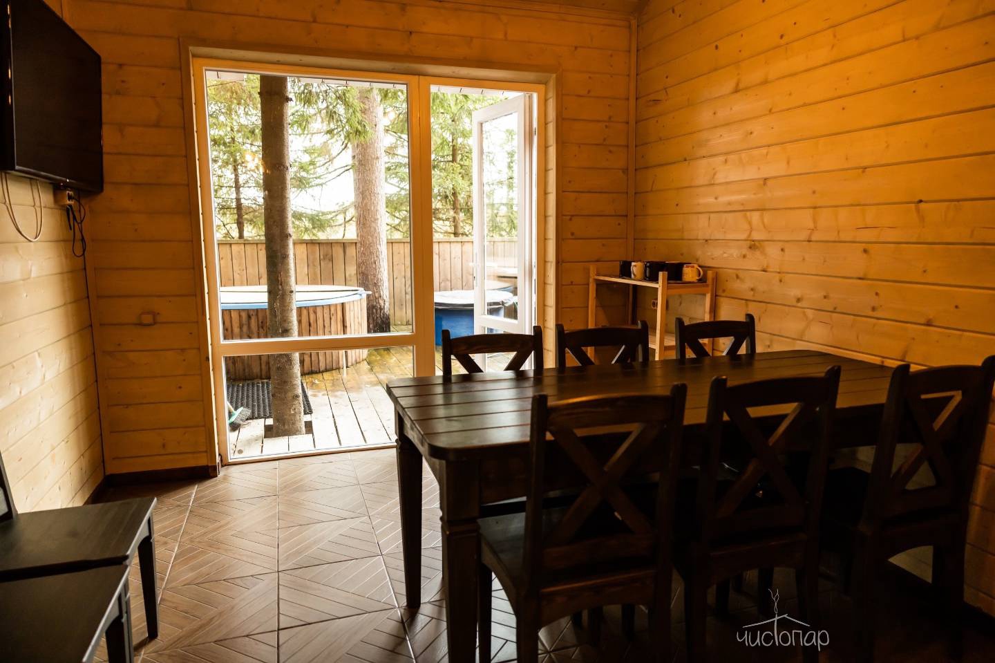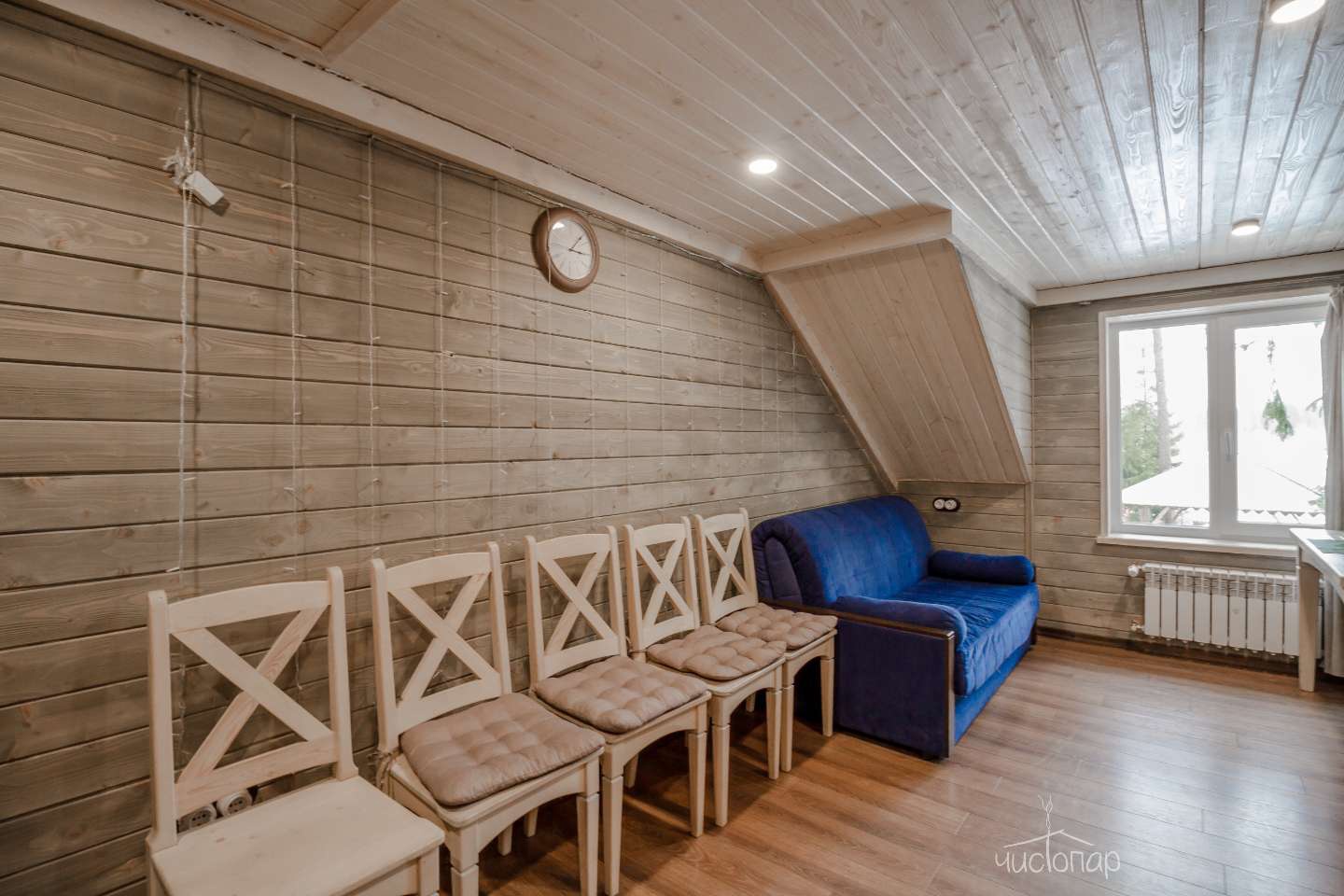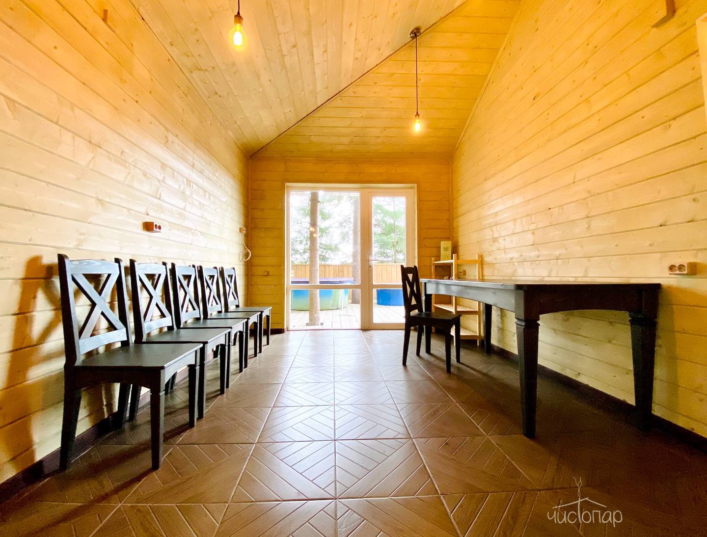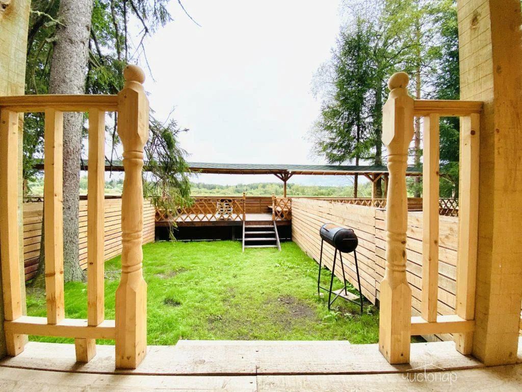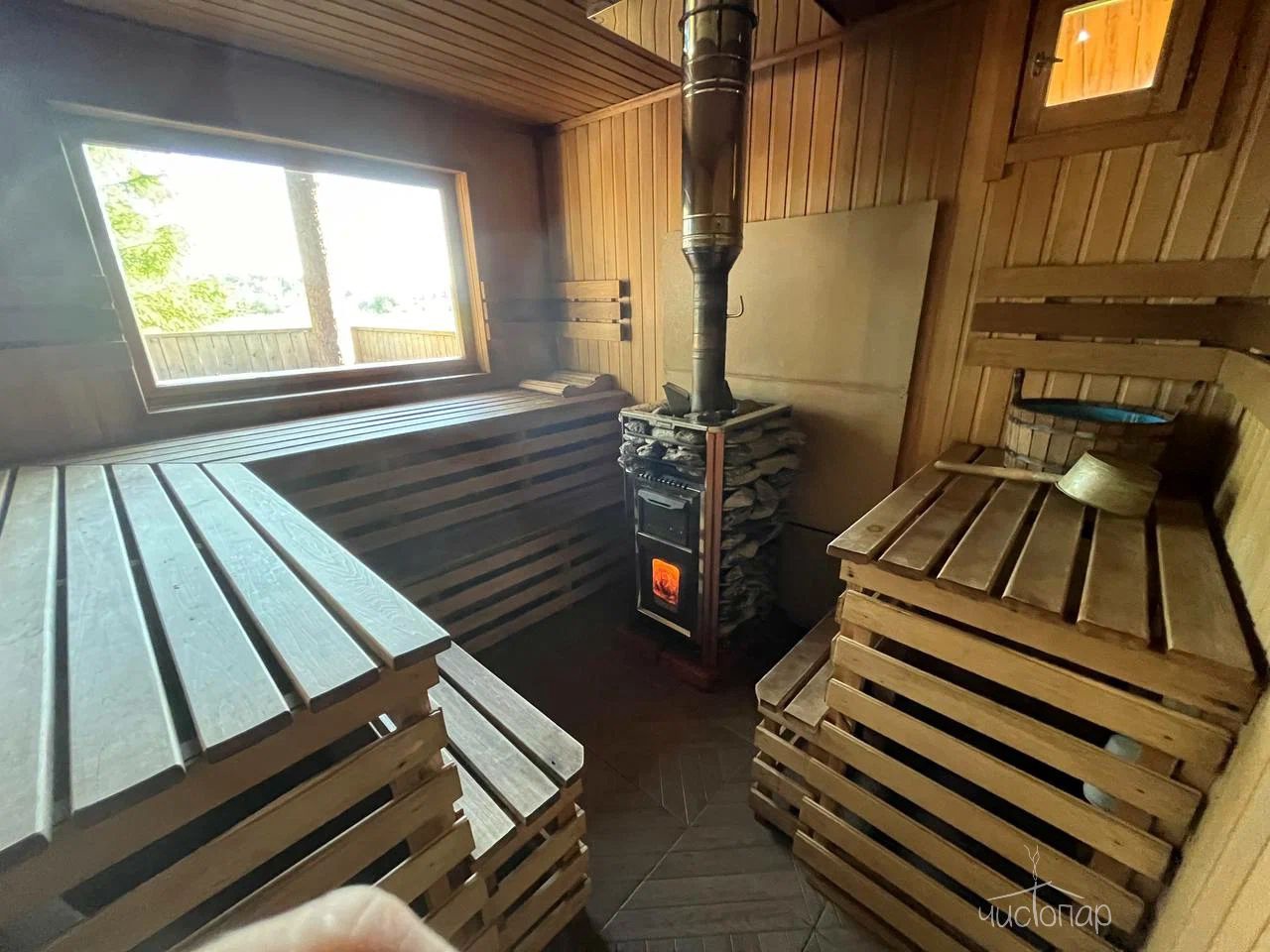 Русская баня на дровах с видом на заводь реки Оредеж и выходом на террасу. База имеет две бани с купелью фурако.