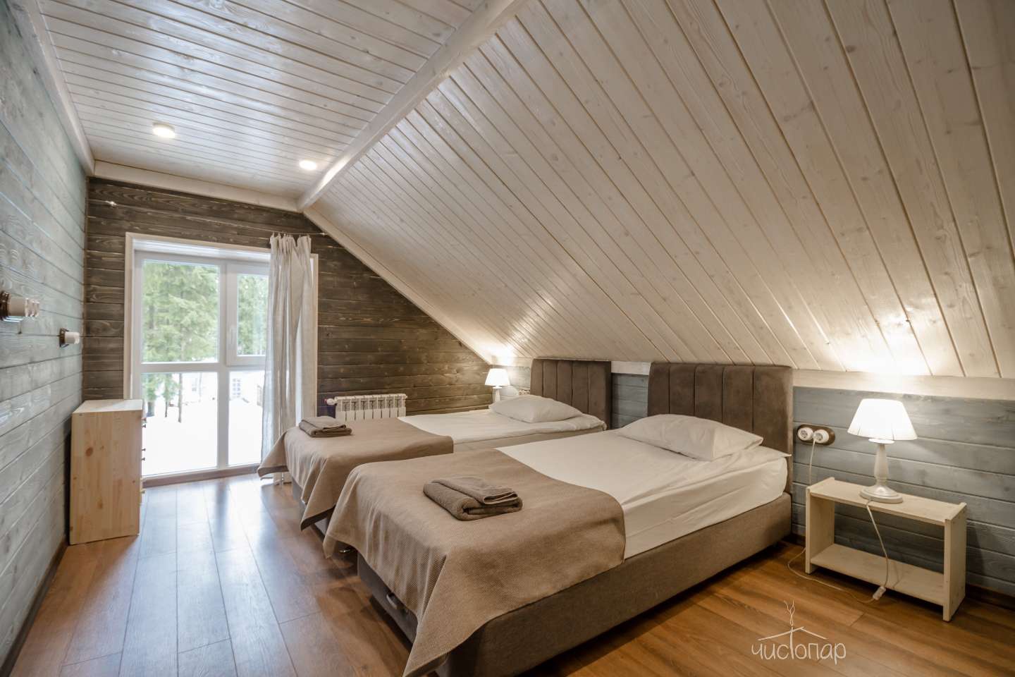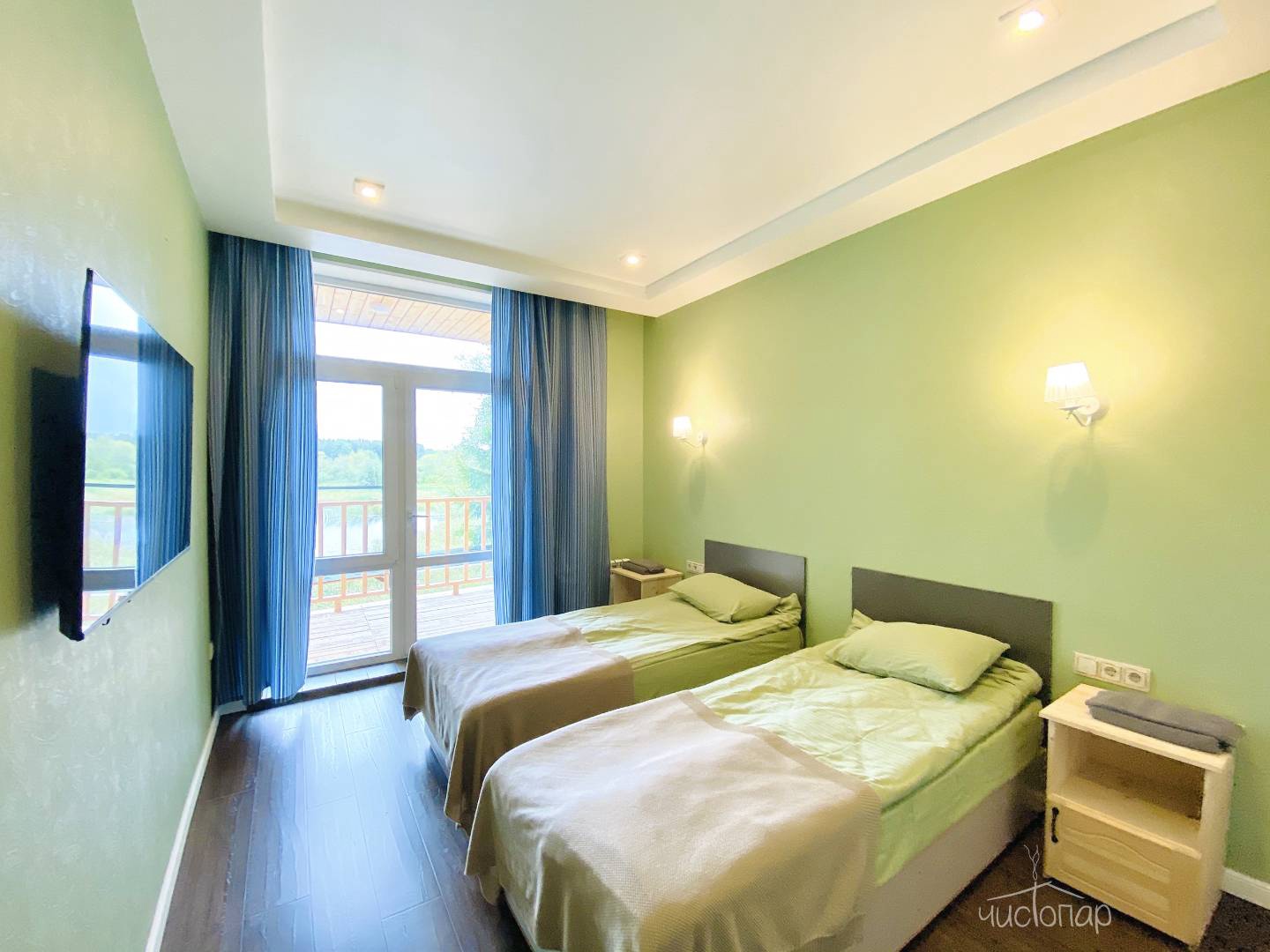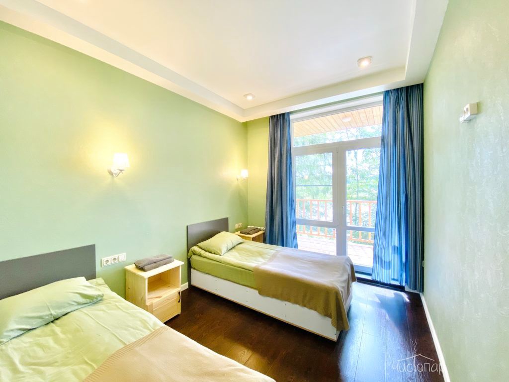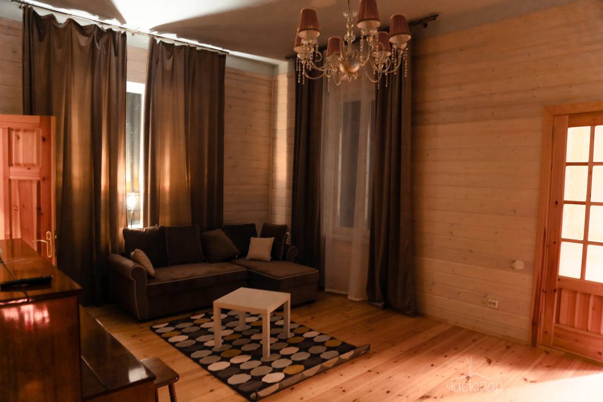 Номер находится на первом этаже и оснащен теплыми полами, состоит из двух комнат и санузла. Основная комната оборудована двумя односпальными кроватями (по желанию их можно совместить в одну большую кровать), вместительным комодом, прикроватными тумбочками, ТВ. Во второй комнате располагается диван-кровать и прикроватная тумбочка. В номере есть все необходимое для комфортного отдыха: телевизор со спутниковым телевидением, бесплатный Wi-Fi, чайник, банные полотенца, косметические средства, фен, тапочки. Заказать питание можно прямо в номер. Заезд в 14:00; Выезд до 12:00.