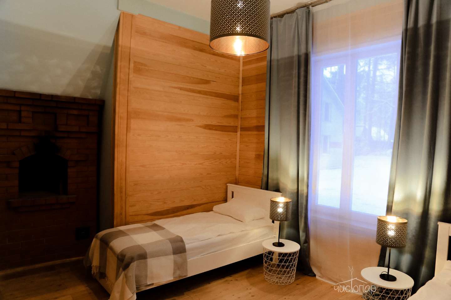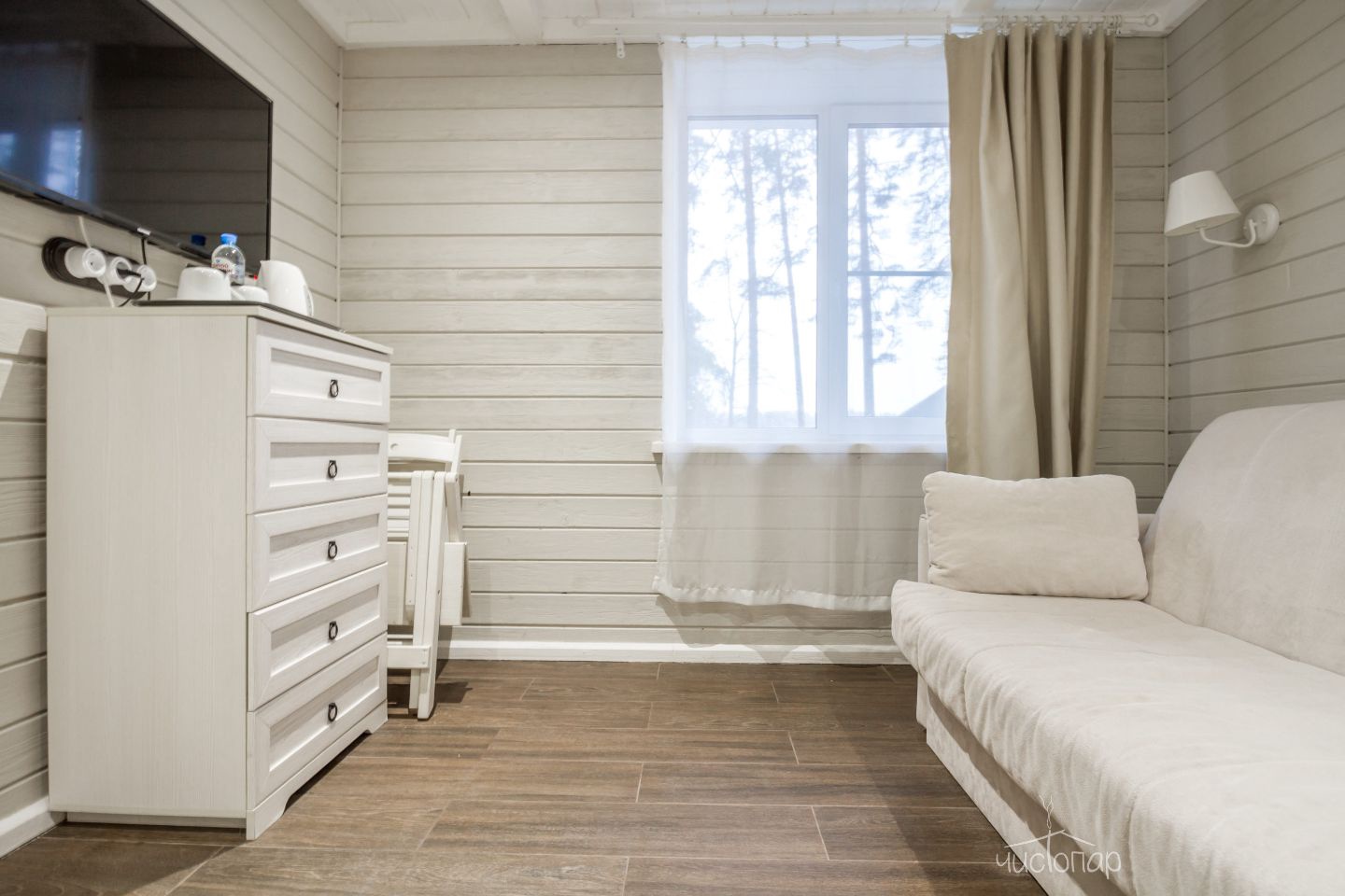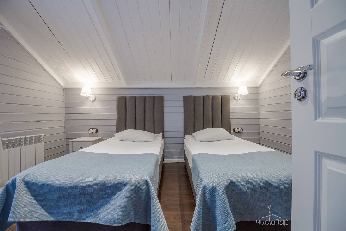Номер находится на первом этаже и оснащен теплыми полами, состоит из двух комнат и санузла. Основная комната оборудована двумя односпальными кроватями (по желанию их можно совместить в одну большую кровать), вместительным комодом, прикроватными тумбочками, ТВ. Во второй комнате располагается диван-кровать и прикроватная тумбочка. В номере есть все необходимое для комфортного отдыха: телевизор со спутниковым телевидением, бесплатный Wi-Fi, чайник, банные полотенца, косметические средства, фен, тапочки. Заказать питание можно прямо в номер. Заезд в 14:00; Выезд до 12:00.