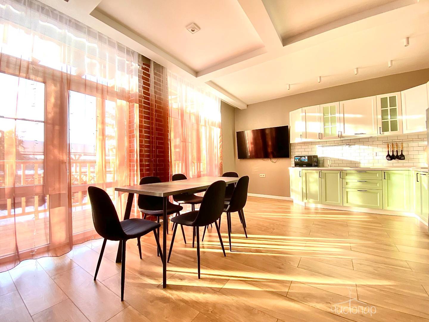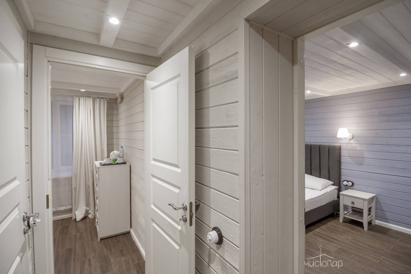 Отличный вариант для семьи с маленькими детьми, номер находится на первом этаже и оснащен теплыми полами, состоит из двух комнат одна из которых проходная, что совершенно не доставляет дискомфорта отдыхающим. В номере есть все необходимое для комфортного проживания: банные полотенца, тапочки, чайник, посуда, косметические средства, вместительный комод, прикроватные тумбочки, тв, Wi-fi. Время заезда: 14:00, выезд до 12:00