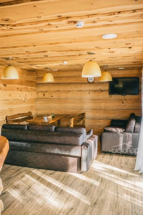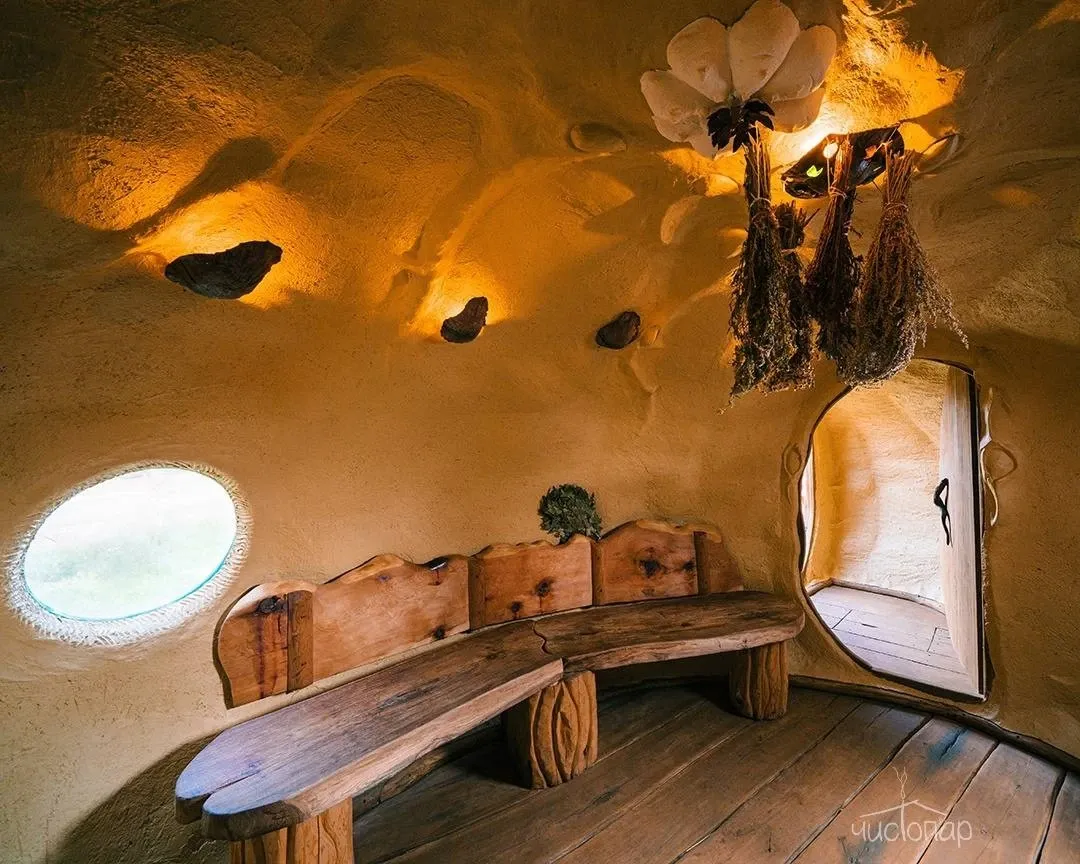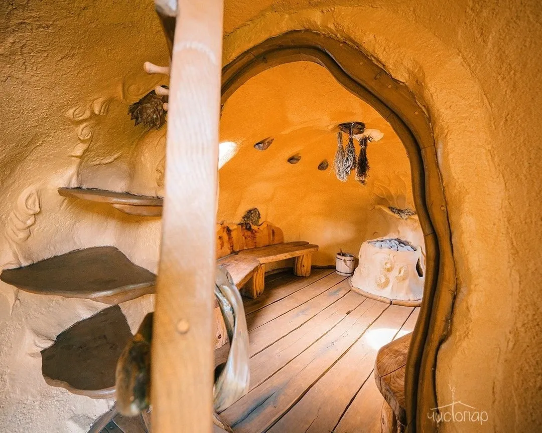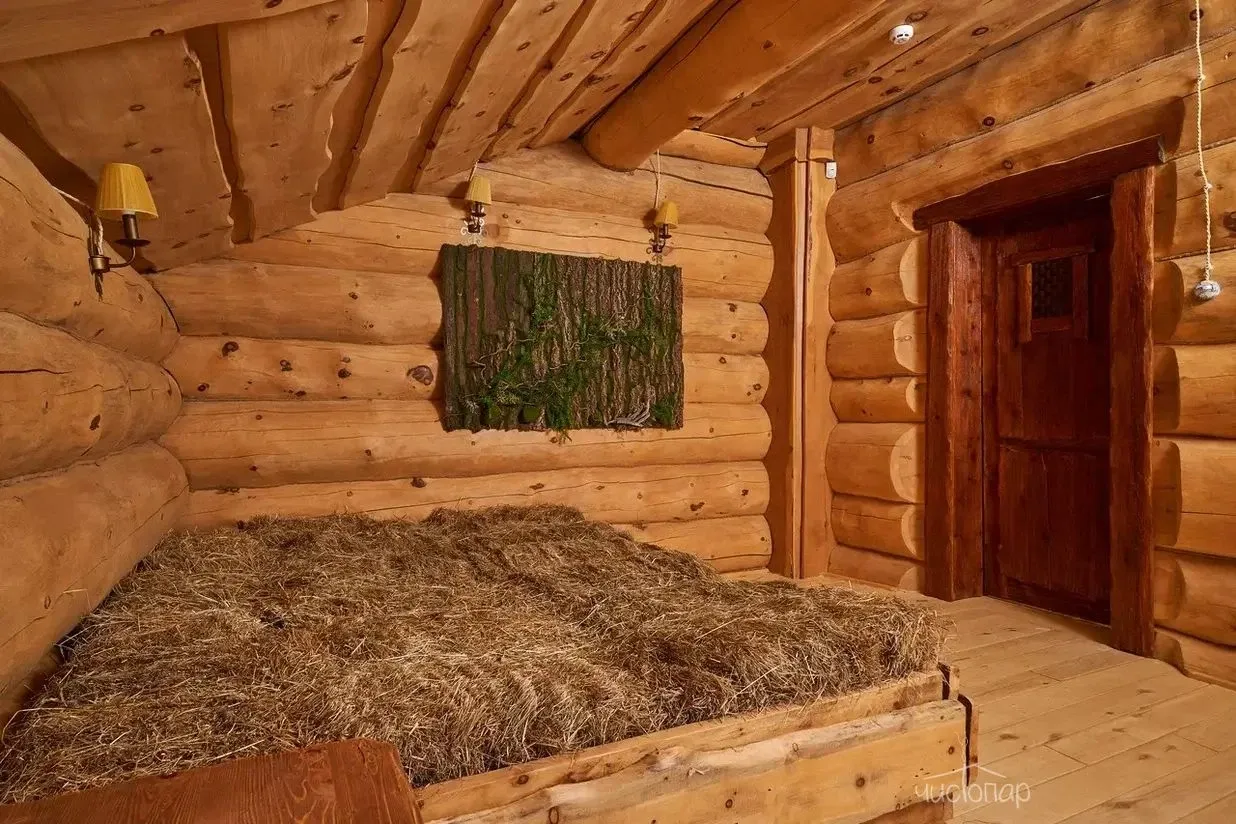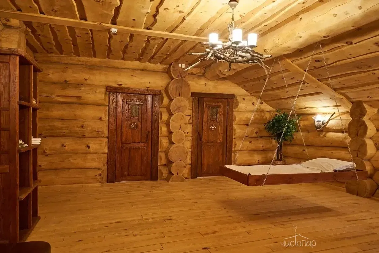 На двух этажах кедровой бани есть всё для комфортного отдыха: несколько душевых, комната для мыльного массажа, большое помещение для отдыха и даже кровать-качели и диван из сена.