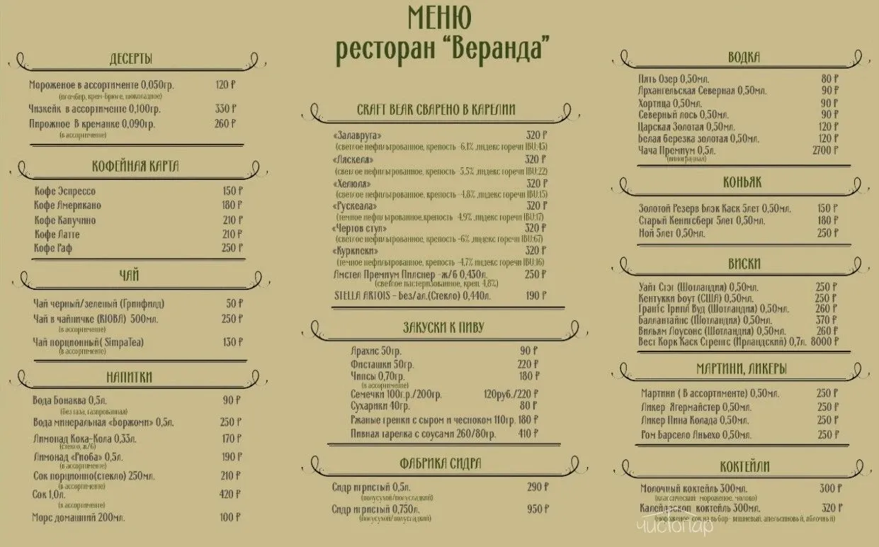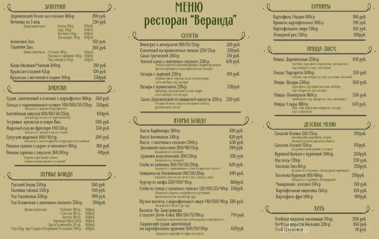 Ресторан «Веранда» работает ежедневно по будням с 09 до 22 часов , в выходные дни с 09 до 00 часов.
