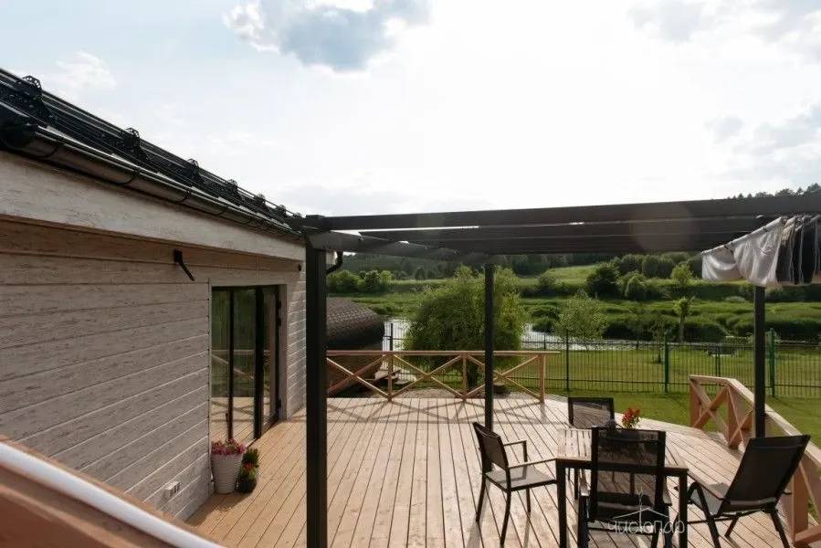 В доме двуспальная кровать с белоснежным бельем, уютный лофт для маленьких непосед с широким двуспальным матрасом, кухня, оборудованная духовкой, микроволновкой, холодильником, посудомойкой и морозильной камерой, а также сервировочной посудой на 4х на любой случай, туалет, душ, стиральная машина, кондиционер, телевизор, фен, Алиса и, конечно, большое панорамное окно с видом на реку и сосновый бор на холме. На террасе можно сидеть за столиком.