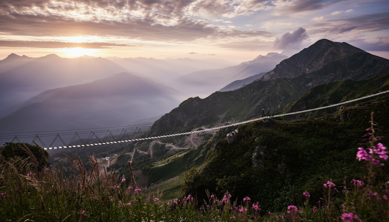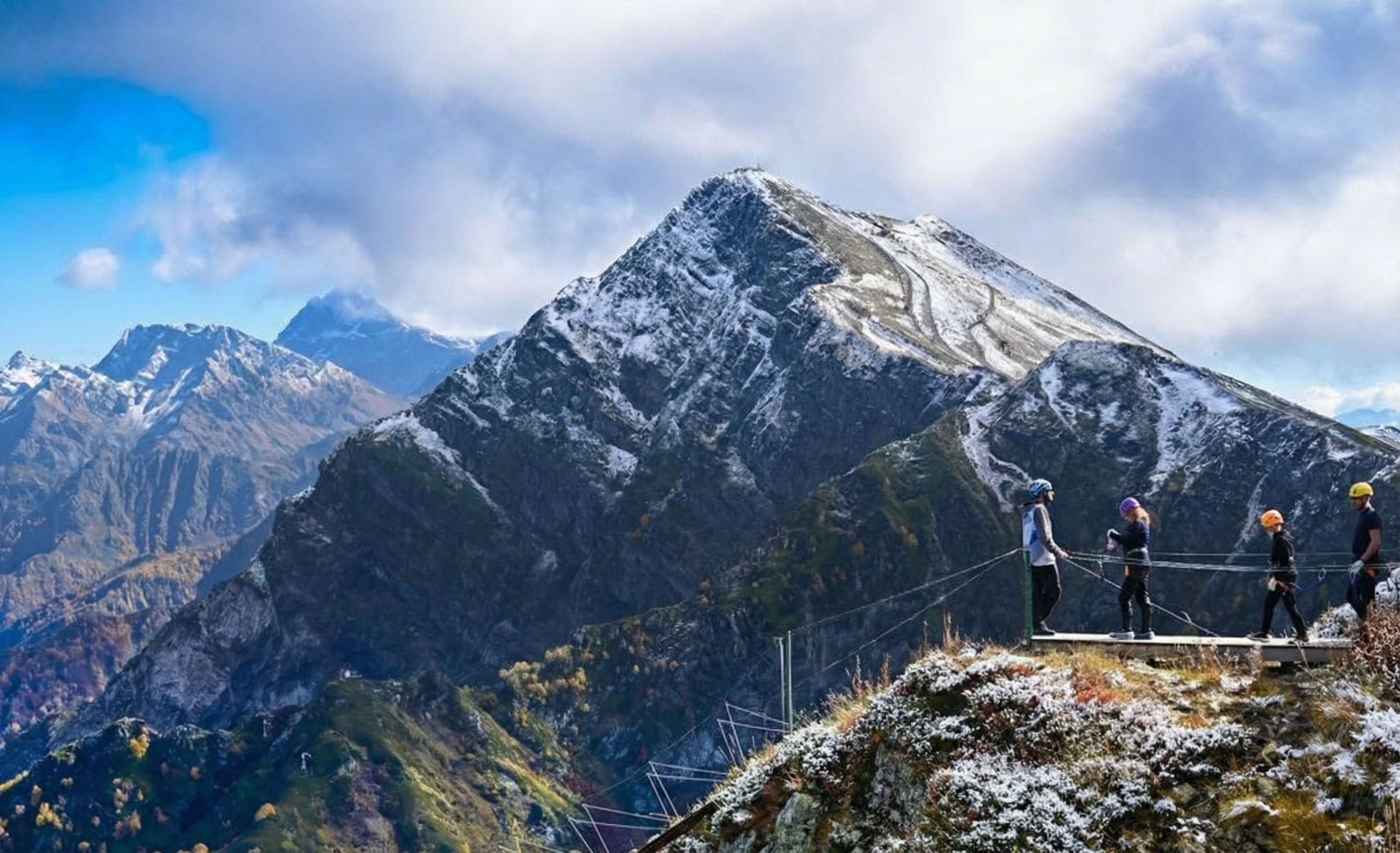 Для тех, кто добрался до остановки «Роза Пик», подготовлены занятия, по настоящему захватывающие дух, – советуем посетить вершину не только лыжникам и сноубордистам. Прочувствовать величие здешних гор можно в экстрим-парке, на горных качелях над обрывом (катание со страховкой и шлемом от 1500 ₽), или на прогулке по деревянному веревочному мосту над пропастью (от 1500 ₽, рост человека – от 140 см).
