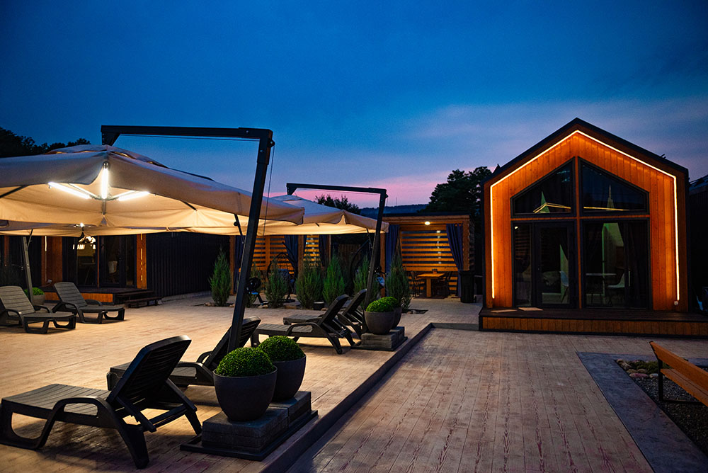 Вы сможете разместиться в одном из стильных домов, выполненных в направлениях «Вип-хаус» и «Барнхаус», от 12 000 рублей за сутки. К услугам гостей — подогреваемый бассейн, который станет отличным дополнением к вашему отдыху. Но жемчужиной пребывания здесь станет банный отдых в настоящей русской бане, где пар, обогащенный ароматами дубовых, березовых и можжевеловых веников, целебными маслами и минеральной солью, наполнит вас силами. Продолжить банный ритуал можно в купелях: освежиться в холодной купели или понежиться в горячей.