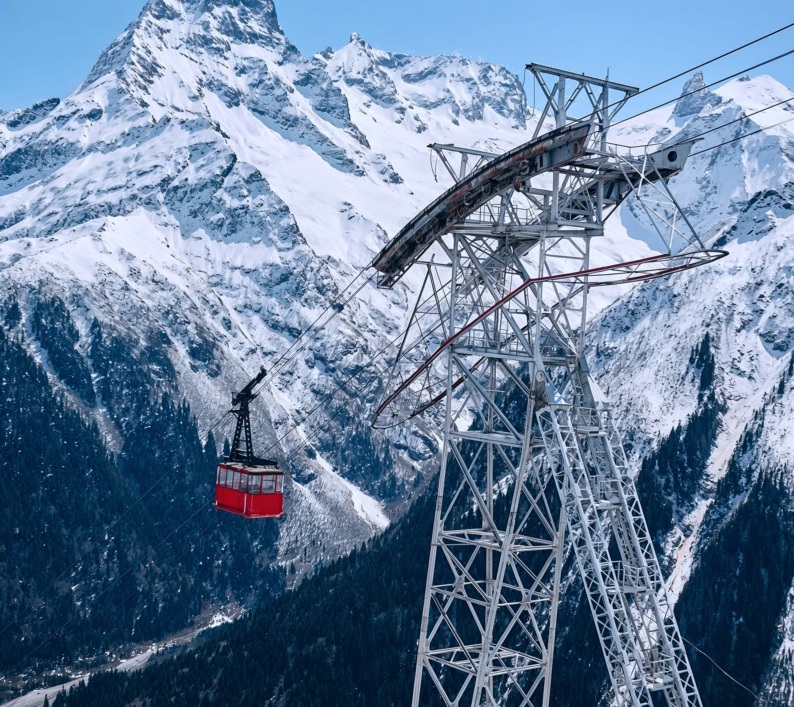 Домбайская поляна — отправная точка для восхождения. Система канатных дорог здесь уникальна тем, что позволяет туристам, включая некатающихся, подняться на высоту более 3000 метров к вершине горы Мусса-Ачитара, чтобы увидеть природные масштабы во всей их красе. Важно отметить, что они работают круглый год.